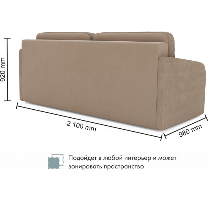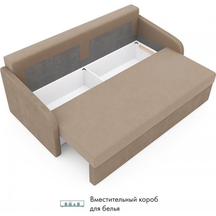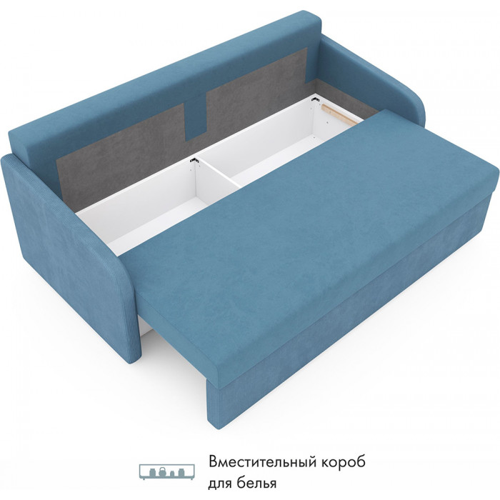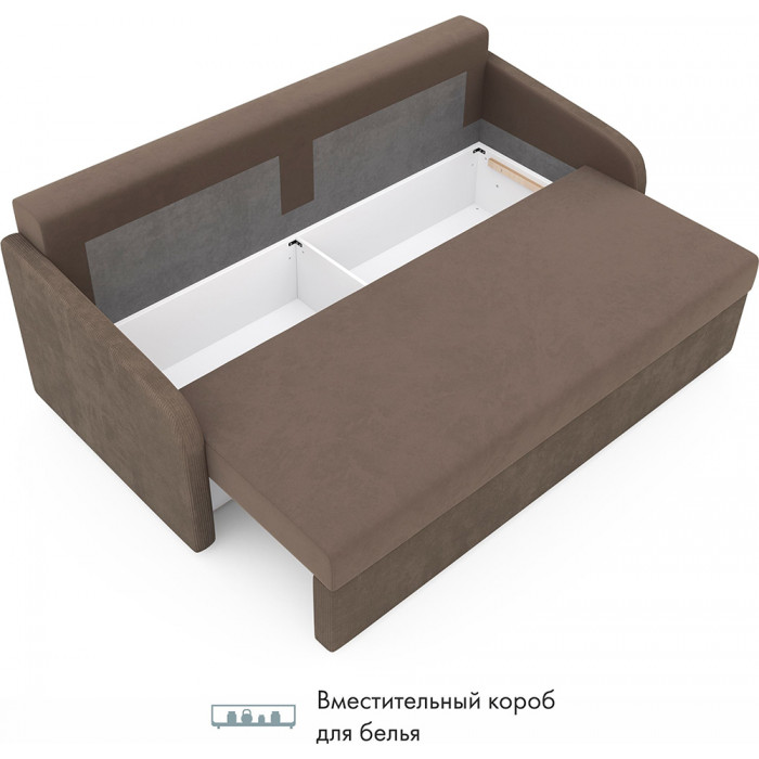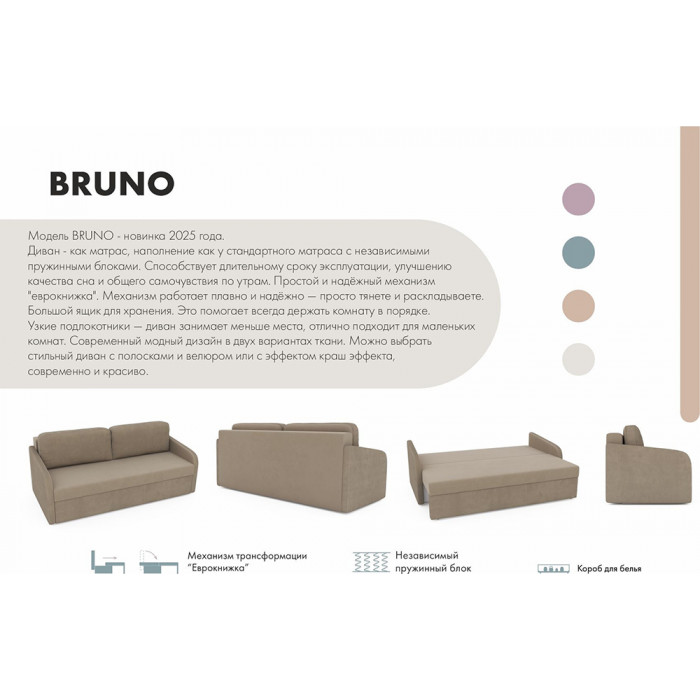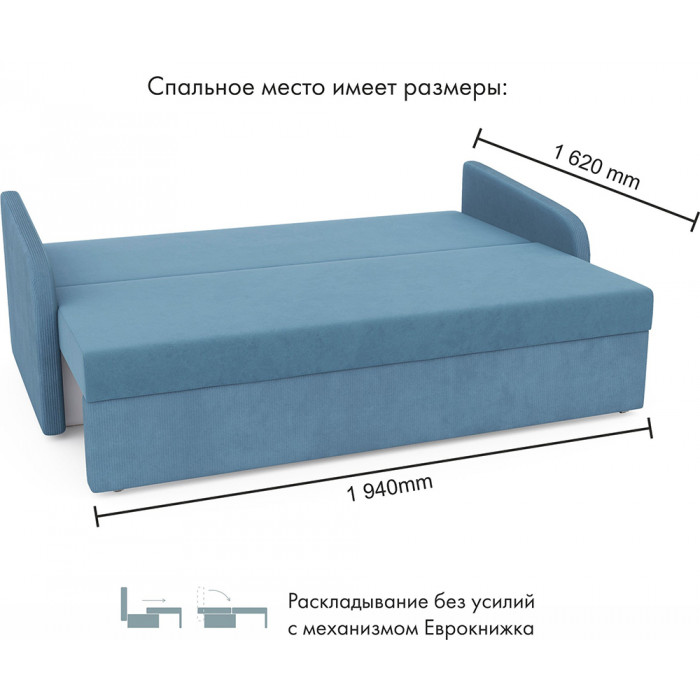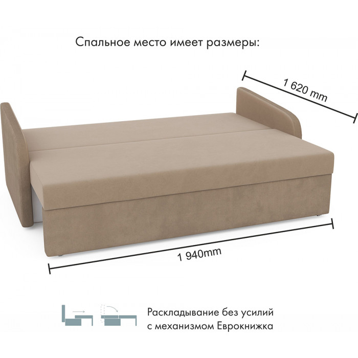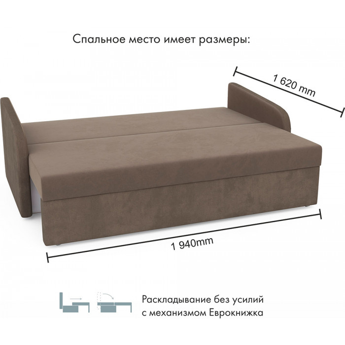 Прямой диван Mio Tesoro Bruno с механизмом «еврокнижка» раскладывается в просторное спальное место 162×194 см. Велюровая обивка, удобные подушки спинки и вместительный ящик для белья делают его практичным выбором для ежедневного отдыха.