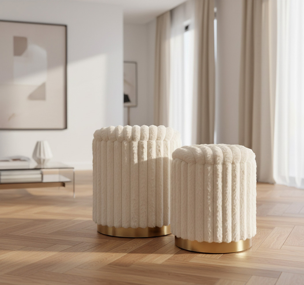 Комплект из двух круглых пуфов разного размера с мягкой тканевой обивкой и внутренними отделениями для хранения. Идеальное решение для создания уютной зоны отдыха и рационального использования пространства.