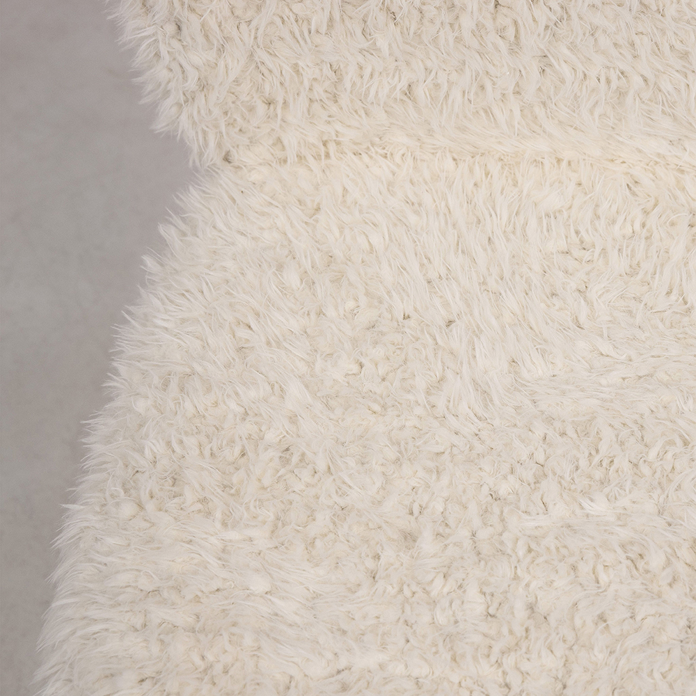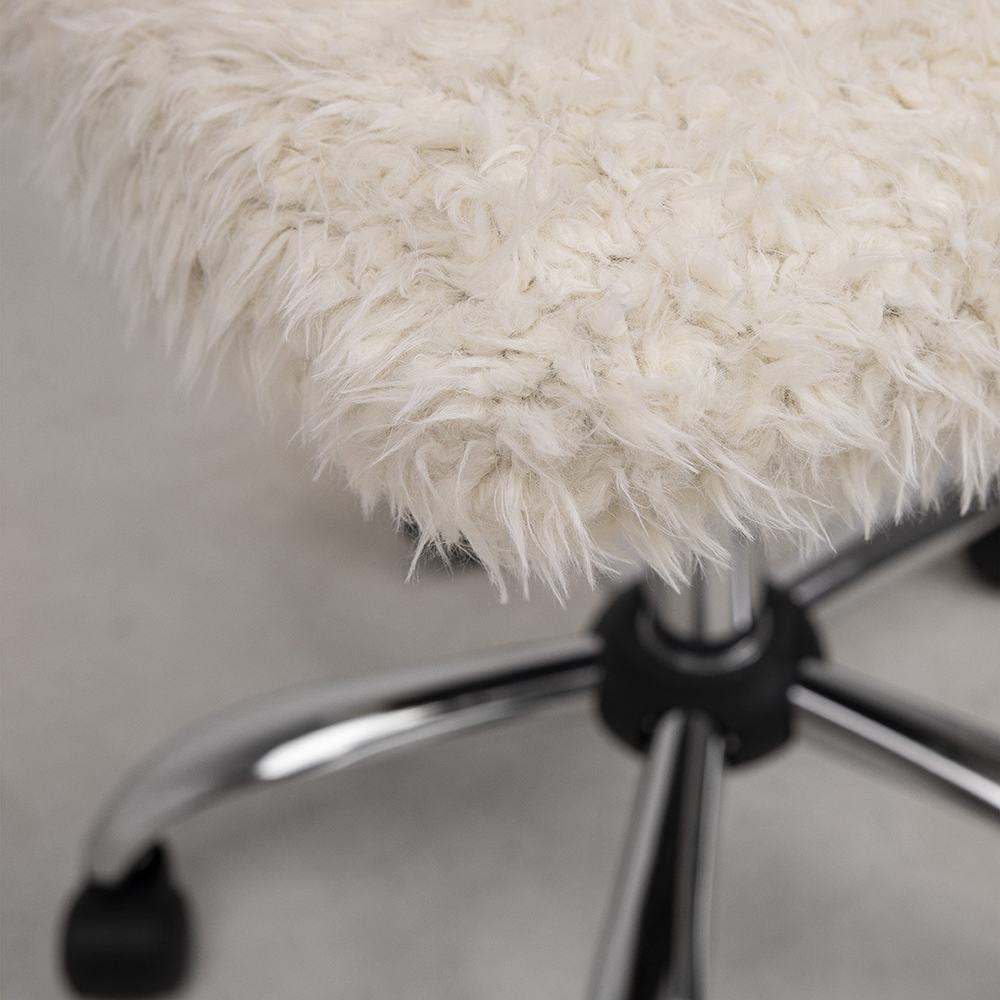 Спинка и сиденье выполнены из износостойкого и прочного искусственного меха. Ткань устойчива к разрывам и истиранием, а также неприхотлива в уходе. Колесики позволят комфортно перемещать кресло с места на место. Подлокотники не предусмотрены, однако это не влияет на комфорт.