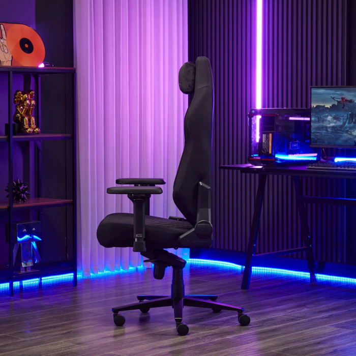 Игровое кресло выполнено из усиленной металлической рамы толщиной 2 мм. Материал покрытия – ткань, устойчивая к выцветанию, истиранию и растяжению.