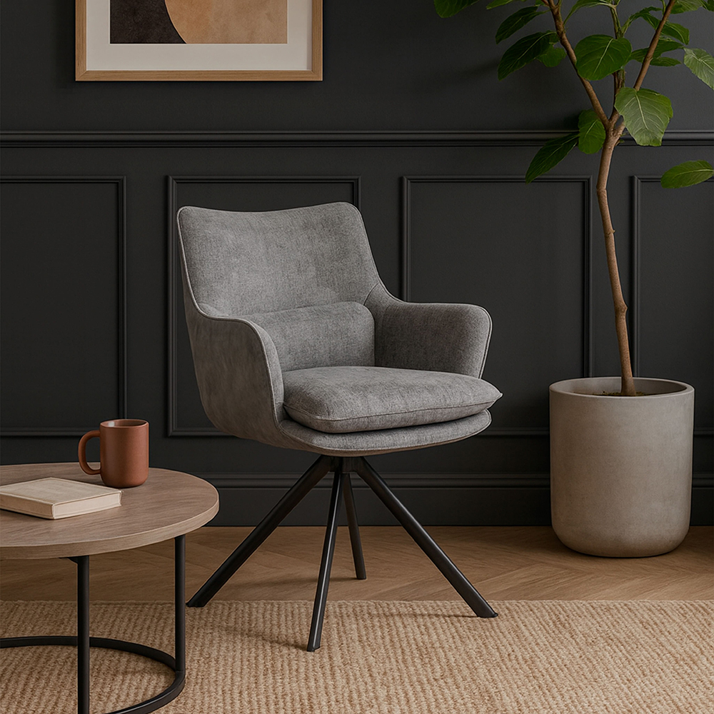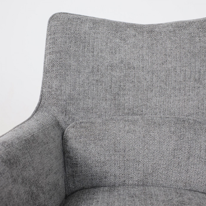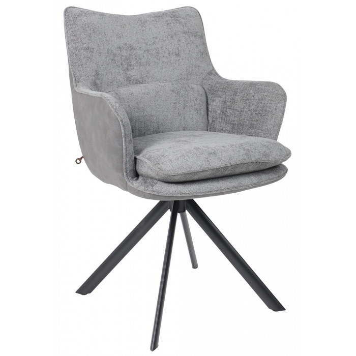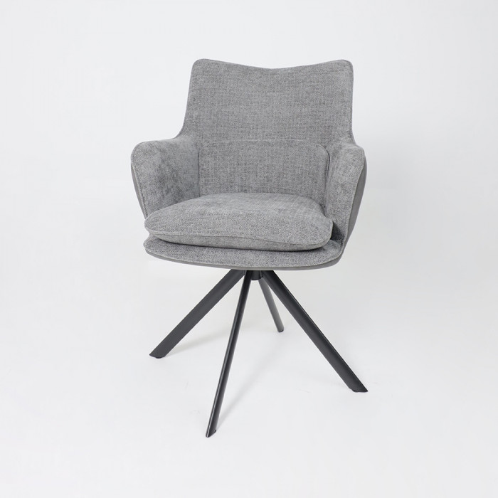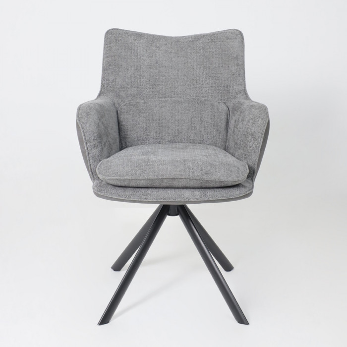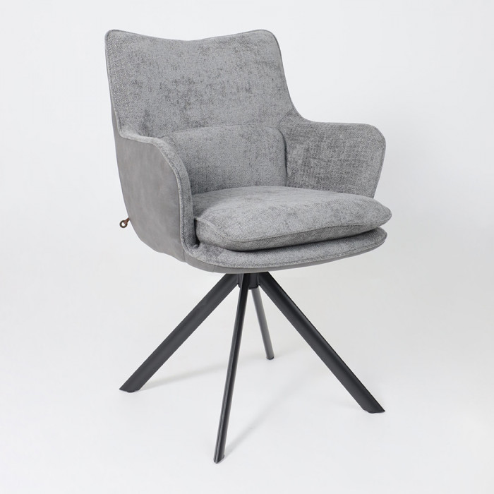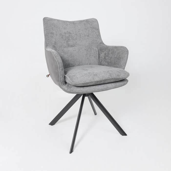 Его ключевая особенность — плавный поворот на 360 градусов, что обеспечивает легкость движений и удобство за обеденным столом. Комбинация благородных материалов — уютного шенилла и тактильной замши — делает стул приятным на ощупь. Прочное металлическое основание гарантирует устойчивость и долговечность, а эргономичные подлокотники добавляют комфорта во время отдыха или беседы.