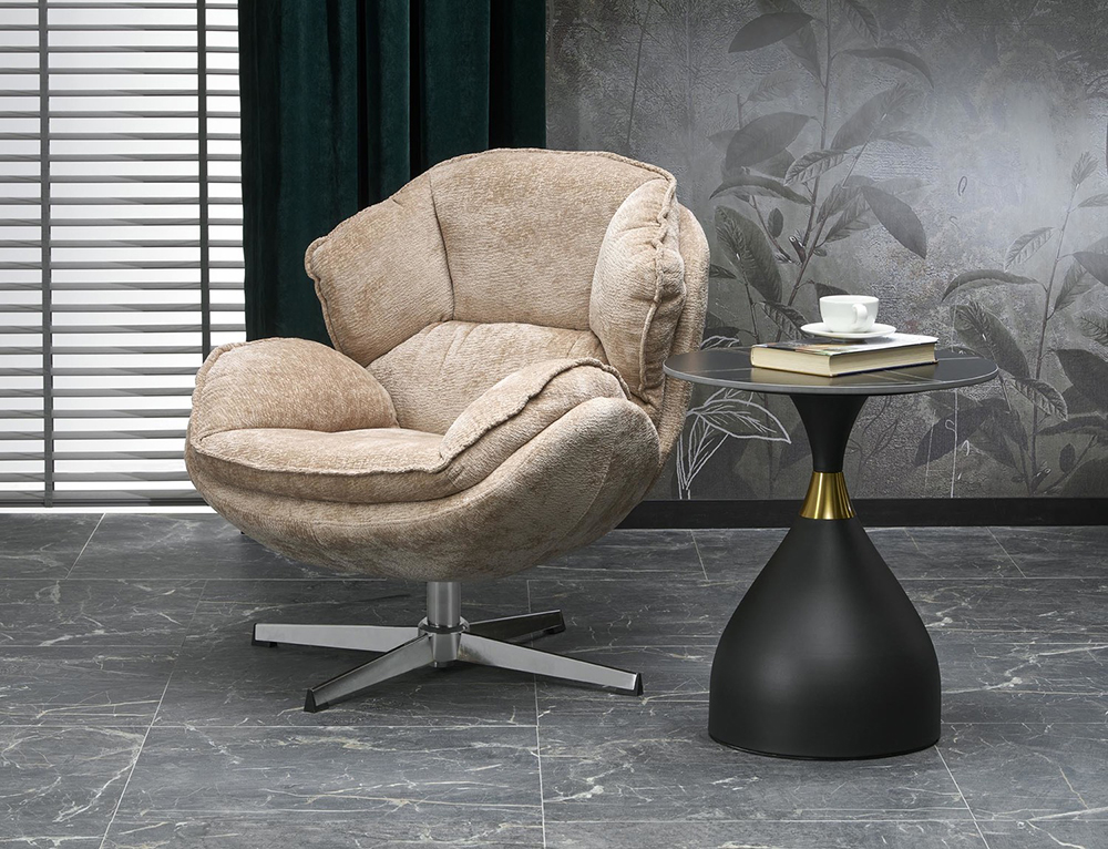 Кресло HALMAR GUIDO с поворотом на 360° и необычной формой сочетает комфорт и стиль. Мягкая тканевая обивка и устойчивая хромированная крестовина делают его практичным и привлекательным выбором для дома.