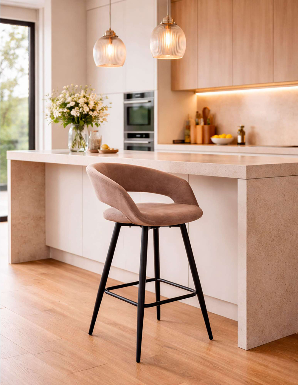 Барный стул BARNY-R 700 — это продуманное сочетание комфорта и стиля для гостиной, кухни, бара или ресторана. Мягкая велюровая обивка приятна на ощупь и создаёт уютную атмосферу, а удобные нерегулируемые подлокотники позволяют расслабиться во время отдыха за барной стойкой. Встроенная подножка обеспечивает дополнительный комфорт, снижая нагрузку на ноги при длительном сидении. Лаконичный дизайн модели легко вписывается в современные интерьеры, добавляя пространству нотку элегантности.