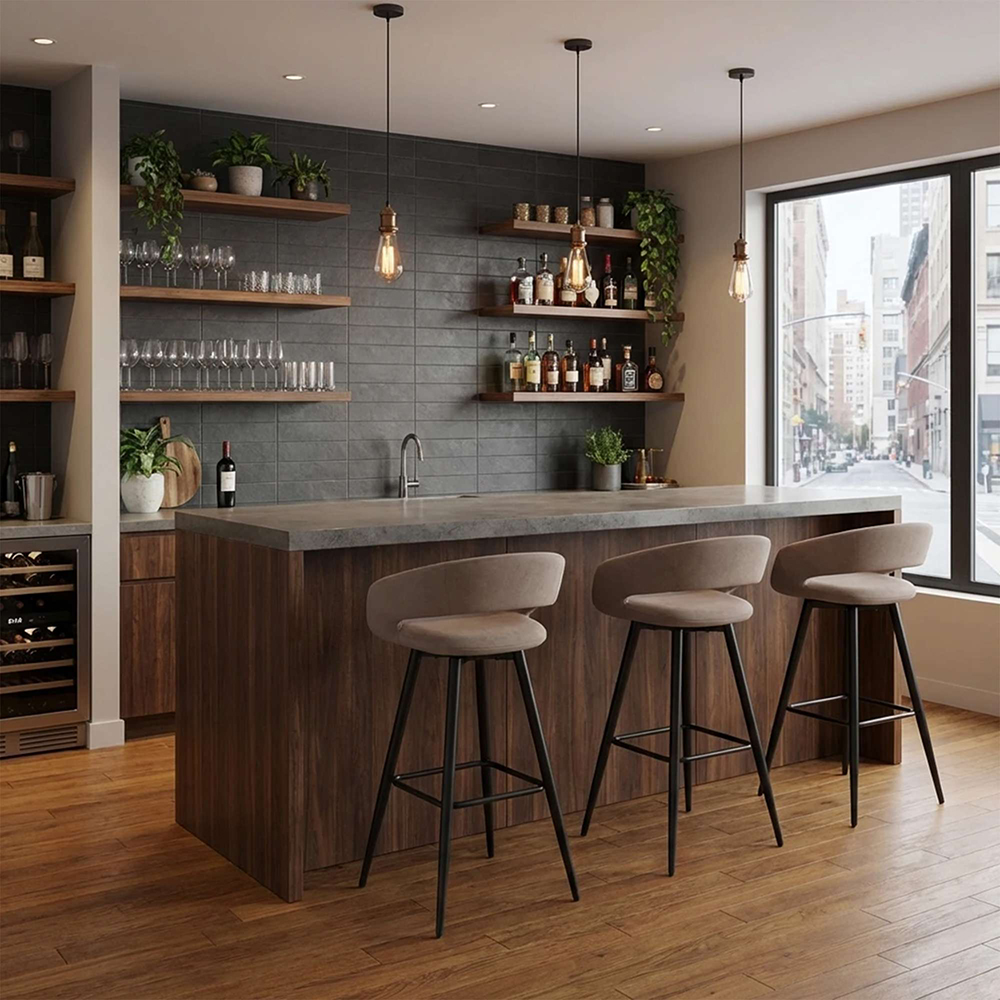Барный стул BARNY-R 900 с мягкой велюровой обивкой, подлокотниками и удобной подножкой. Нагрузка до 100 кг. Идеален для кухни, гостиной или бара.