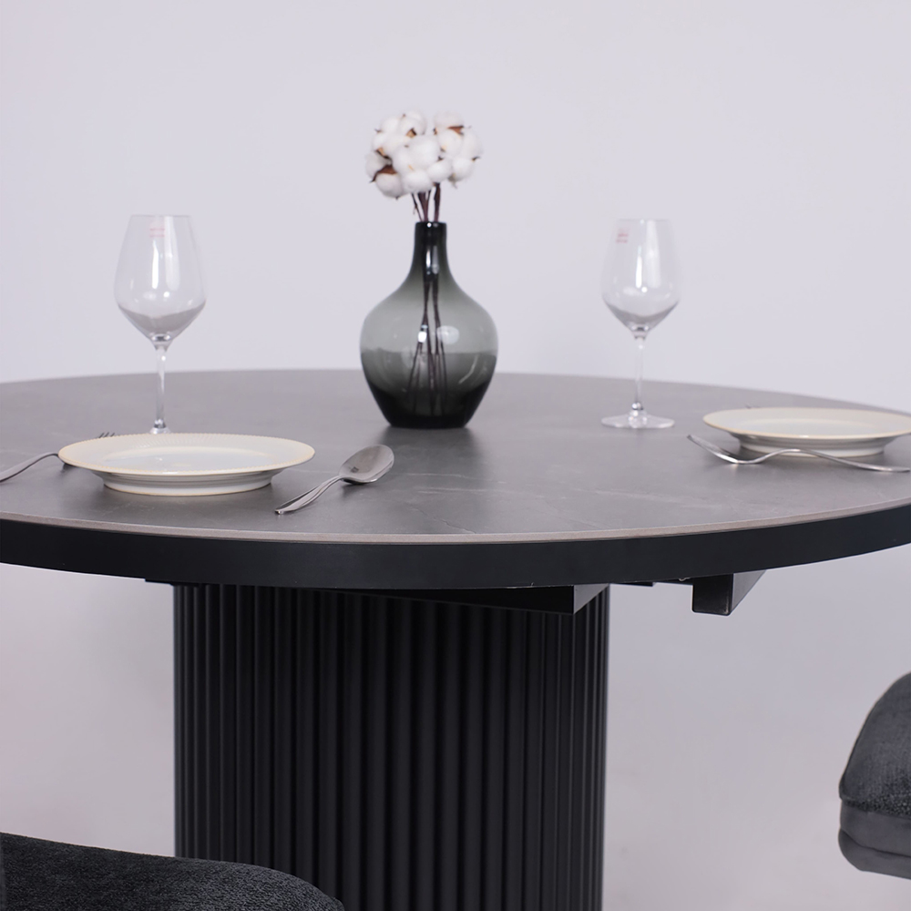 Круглая столешница диаметром 116 см плавно трансформируется в овальную форму размером 156х116 см, раскрывая новые возможности для приема гостей. Многослойная конструкция из МДФ 22 мм с керамогранитным покрытием 9 мм обеспечивает исключительную прочность и устойчивость к повреждениям, а надежный металлический каркас гарантирует стабильность даже в разложенном состоянии.