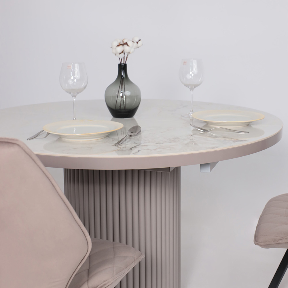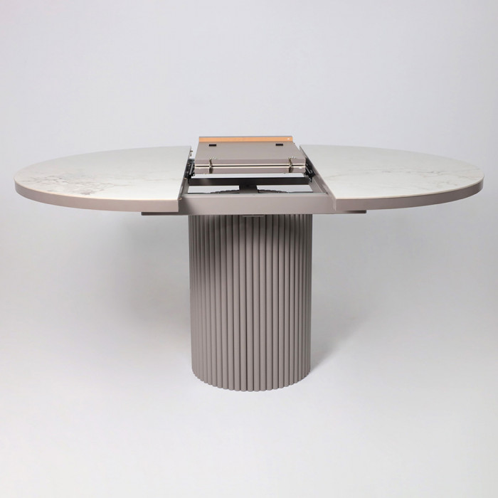Круглая столешница диаметром 116 см плавно трансформируется в овальную форму размером 156х116 см, раскрывая новые возможности для приема гостей. Многослойная конструкция из МДФ 22 мм с керамогранитным покрытием 9 мм обеспечивает исключительную прочность и устойчивость к повреждениям, а надежный металлический каркас гарантирует стабильность даже в разложенном состоянии.