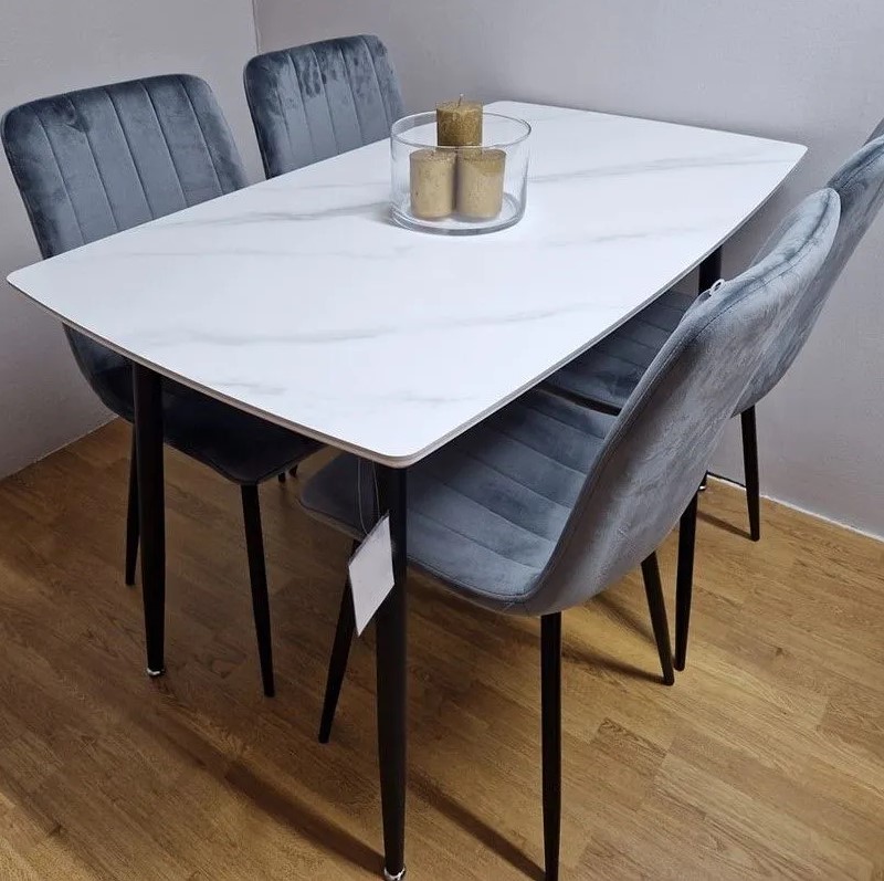 Столешница, выполненная из высококачественного стекла с эффектом белого мрамора, не только добавляет благородства интерьеру, но и обеспечивает простоту ухода и долговечность. Простая, но надежная конструкция из стали гарантирует устойчивость и безопасность, делая стол идеальным выбором для семейных обедов или уютных посиделок с друзьями.