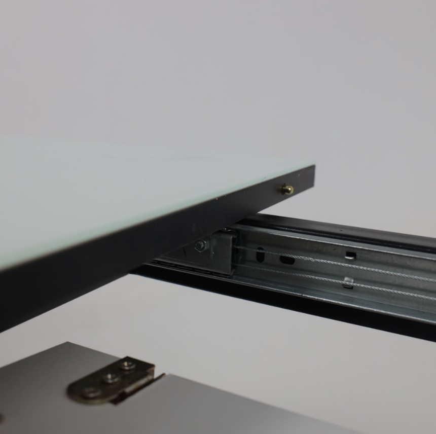 Столешница выполнена из надежного и долговечного материала - ЛДСП, с верхним слоем закаленного стекла. Это придает столу элегантный и стильный вид, а стекло обеспечивает легкость в уходе.