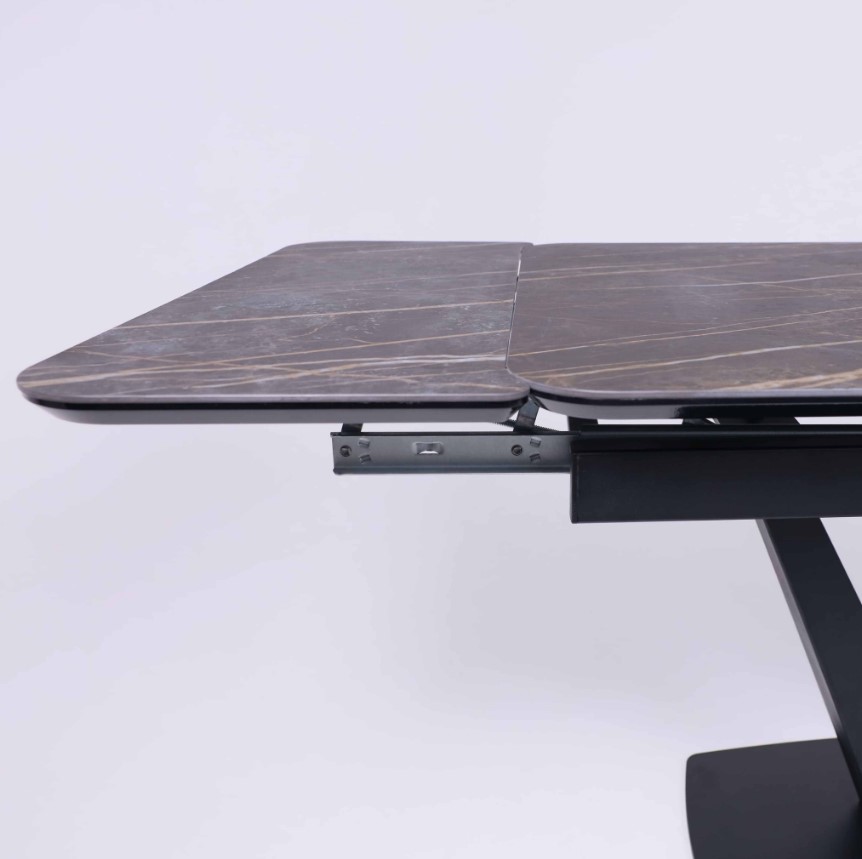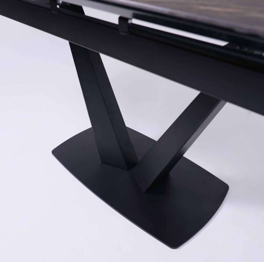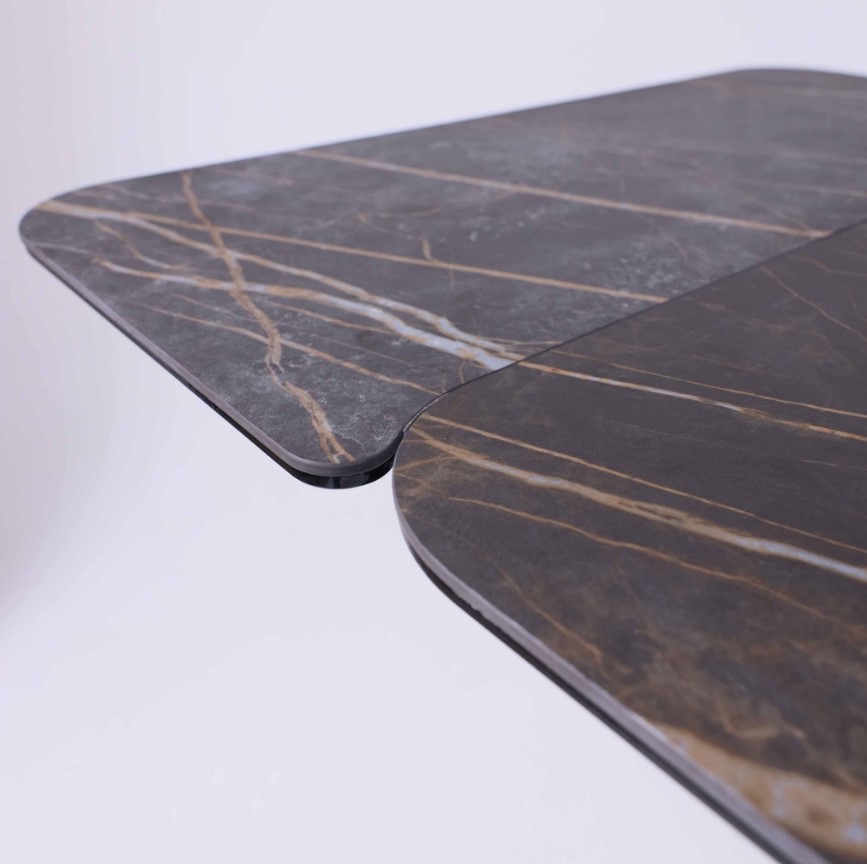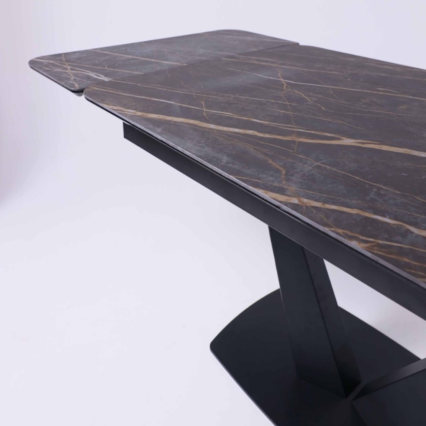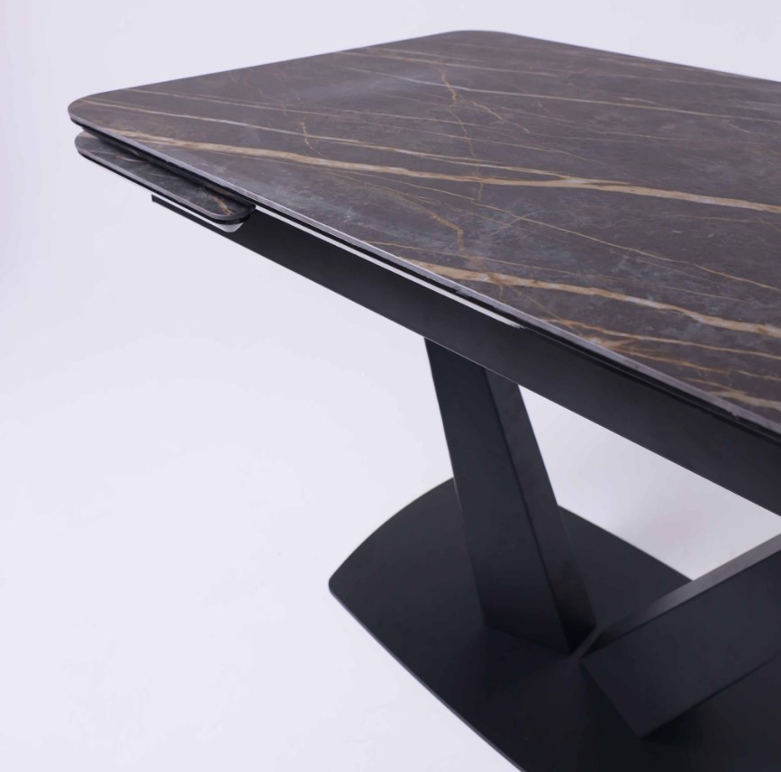 Столешница стола изготовлена из высококачественной керамики, которая отличается прочностью, износостойкостью и легкостью в уходе. Основание стола выполнено из металла, что обеспечивает его устойчивость и долговечность.