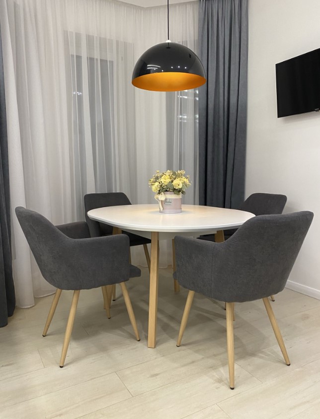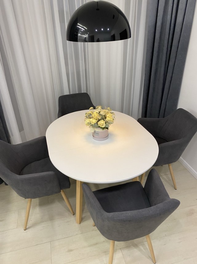 Столешница выполнена из МДФ , благодаря чему стол смотрится стильно. Ухаживать за таким столом не сложно, достаточно протереть влажной салфеткой.