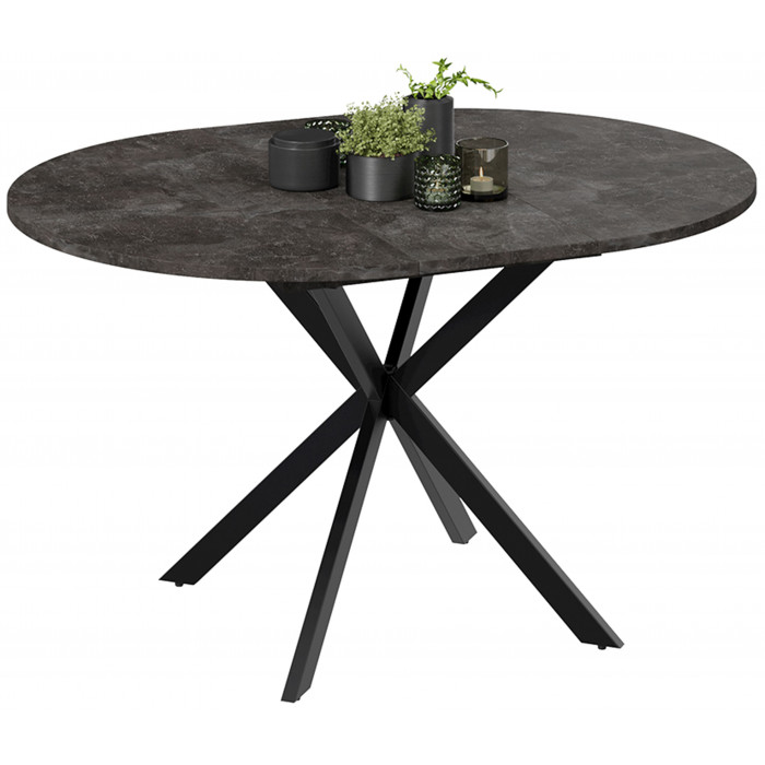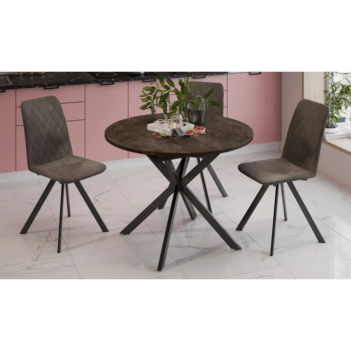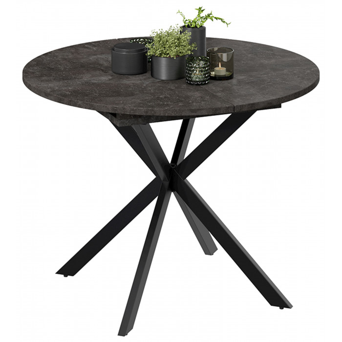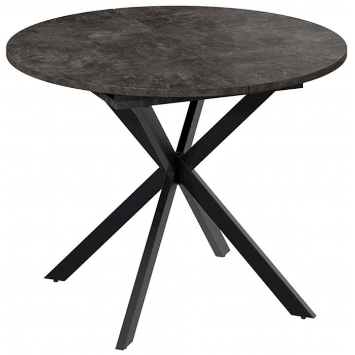 Круглая столешница из ЛДСП в оттенке "ателье тёмный" придает столу изысканный и современный вид, а ее гладкая поверхность устойчива к влаге и легко очищается. Металлическое подстолье черного цвета добавляет конструкции прочности и стиля, создавая гармоничный контраст с темной столешницей. В собранном состоянии стол имеет компактные размеры 100х100х75 см, что делает его идеальным для небольших помещений, а в разложенном виде (131,5х100 см) он превращается в удобный большой стол для приема гостей.