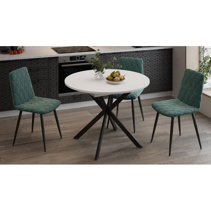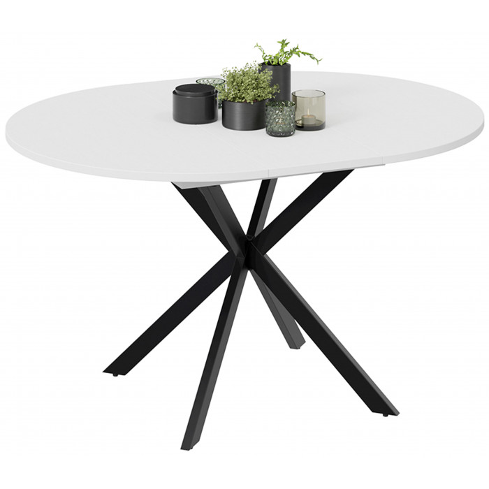 Круглая столешница из ЛДСП придает столу изысканный и современный вид, а ее гладкая поверхность устойчива к влаге и легко очищается. Металлическое подстолье черного цвета добавляет конструкции прочности и стиля, создавая гармоничный контраст с белой столешницей. В собранном состоянии стол имеет компактные размеры 100х100х75 см, что делает его идеальным для небольших помещений, а в разложенном виде (131,5х100 см) он превращается в удобный большой стол для приема гостей.