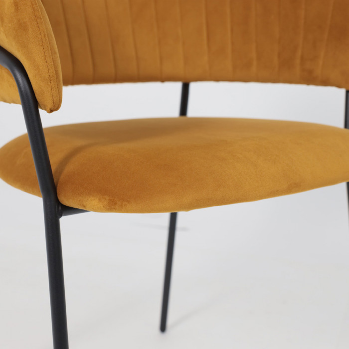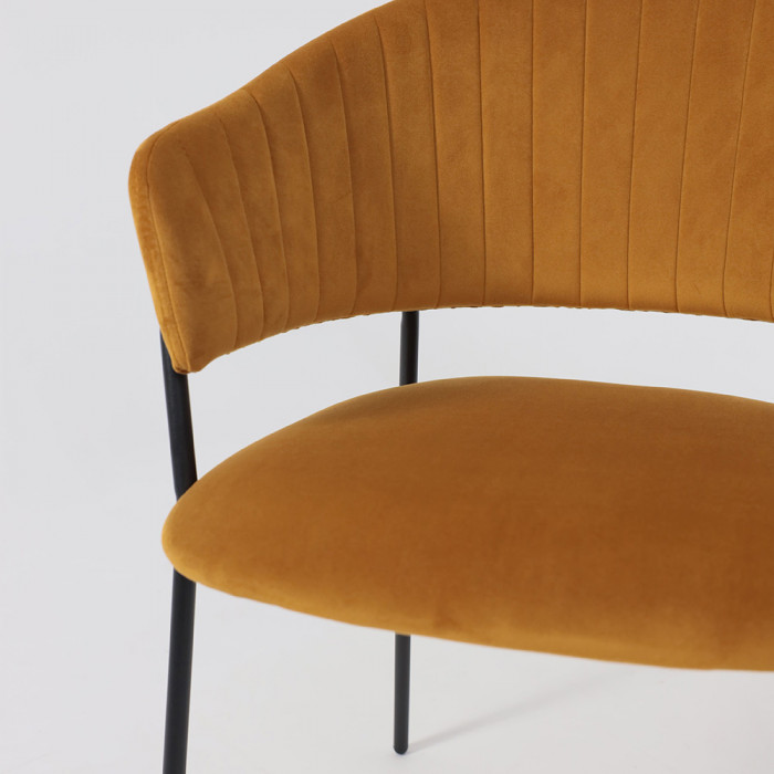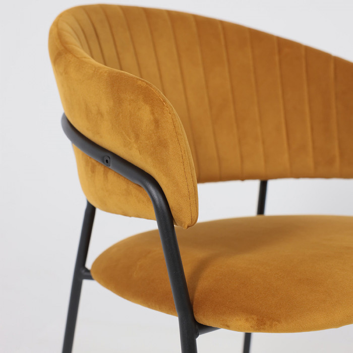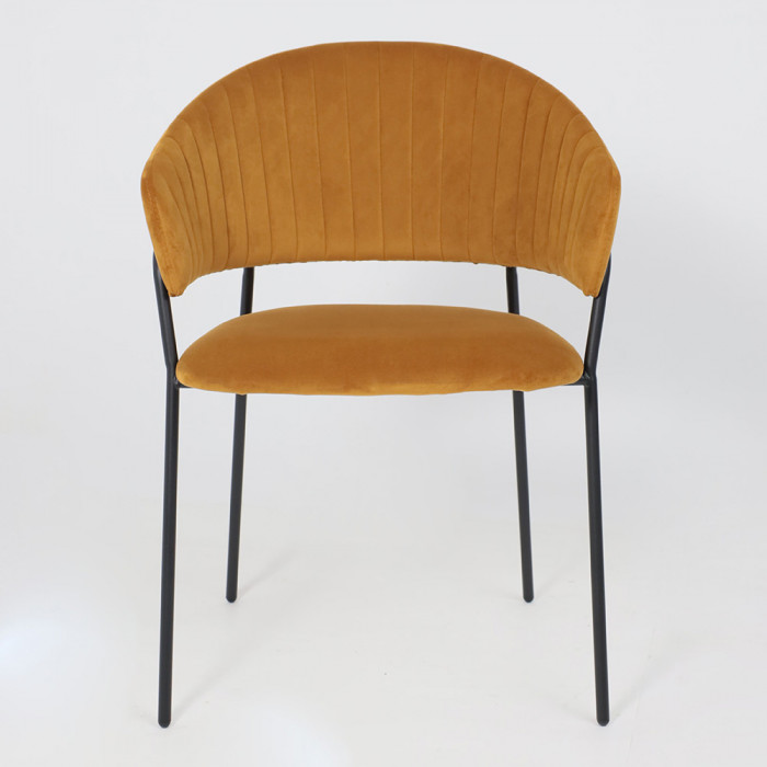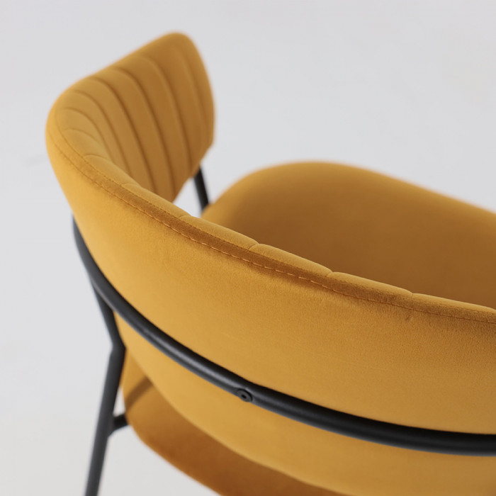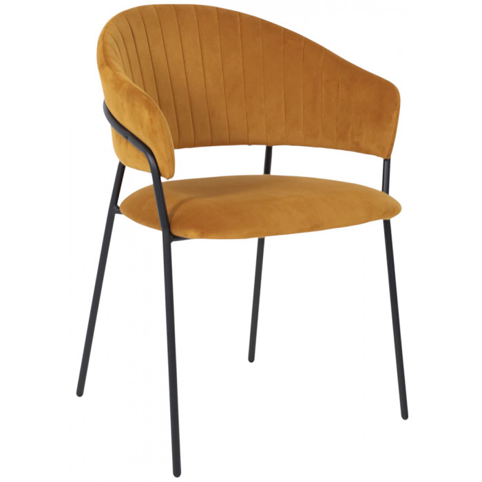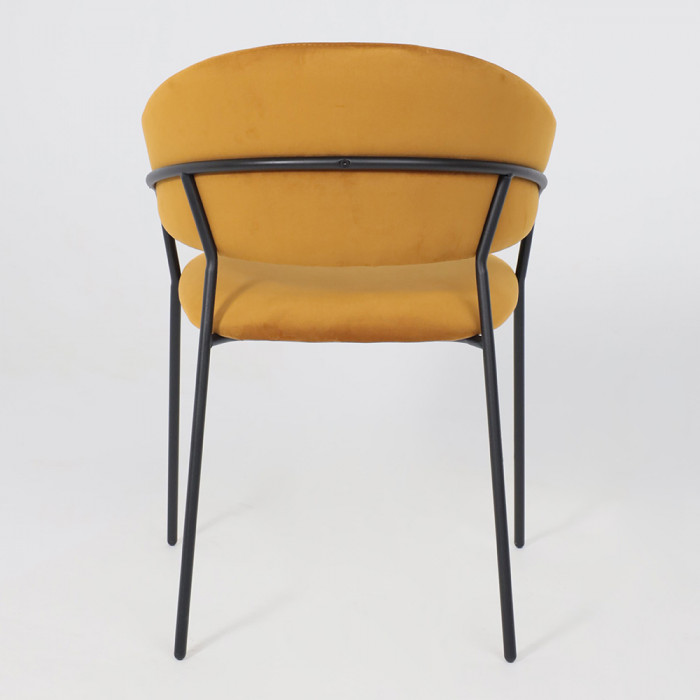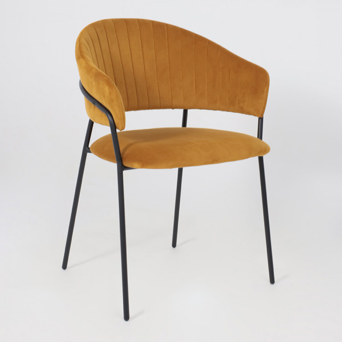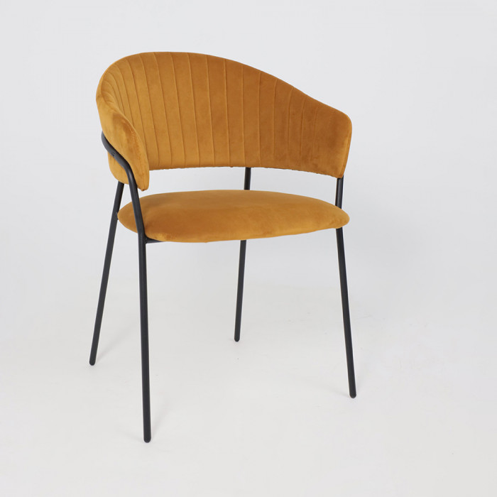 Роскошная бархатная обивка придает интерьеру благородный шик, а плавные линии спинки, перетекающей в изящные подлокотники, создают гармоничный силуэт. Прочное металлическое основание обеспечивает устойчивость и долговечность, делая этот стул не только стильным, но и практичным выбором для ежедневного использования.