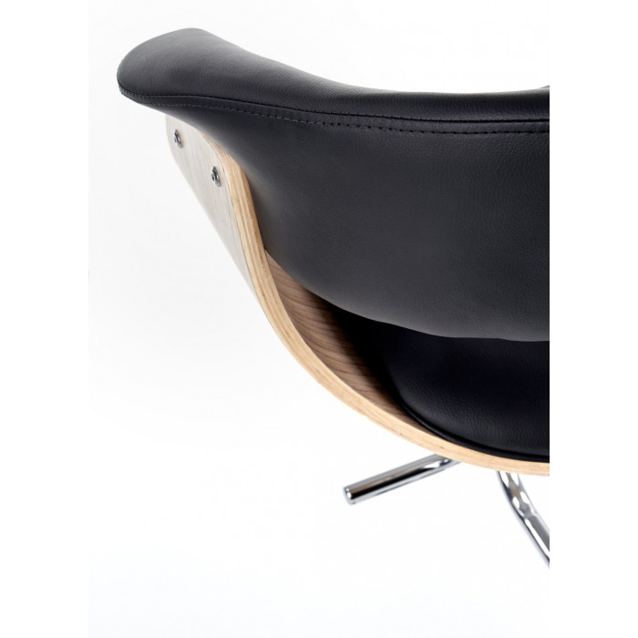 Модель отличается уникальной конструкцией, где изогнутая спинка плавно переходит в удобные подлокотники, создавая комфортную опору для спины и рук. Мягкое сиденье из экокожи и прочный металлический каркас обеспечивают устойчивость и удобство, а встроенная подножка позволяет комфортно расположить ноги. Регулировка высоты позволяет легко адаптировать стул под любую столешницу или барную стойку.