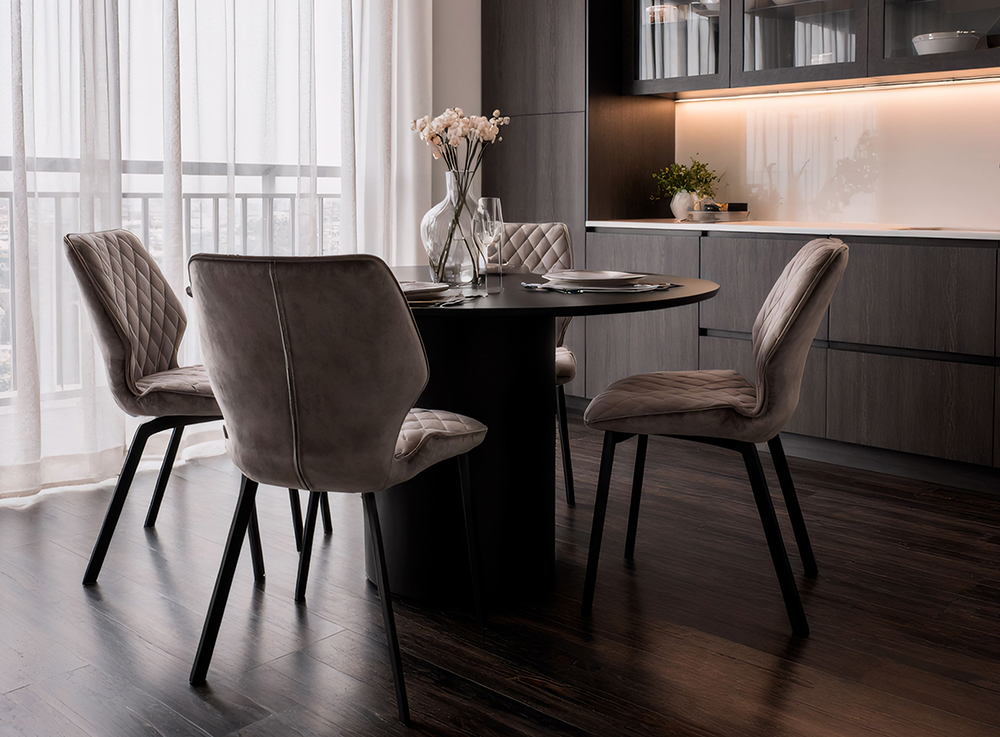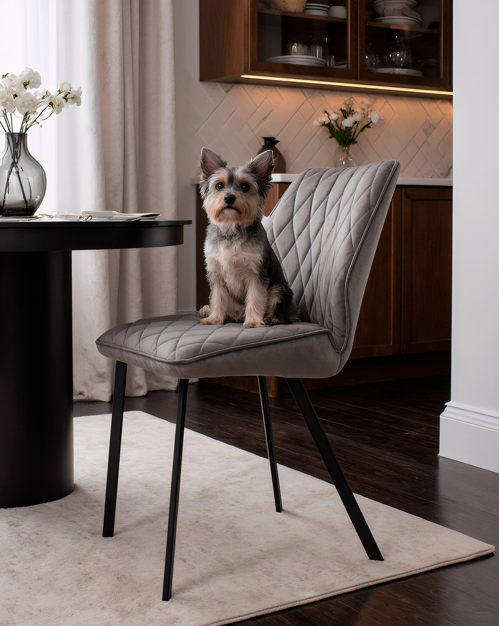 Обивка стула выполнена из мягкого и приятного на ощупь велюра, который не только выглядит роскошно, но и обеспечивает дополнительный комфорт. Ромбовидная строчка по всей обивке добавляет текстуру и изысканность, делая стул настоящим произведением искусства. Металлическое основание придает конструкции прочность и долговечность.