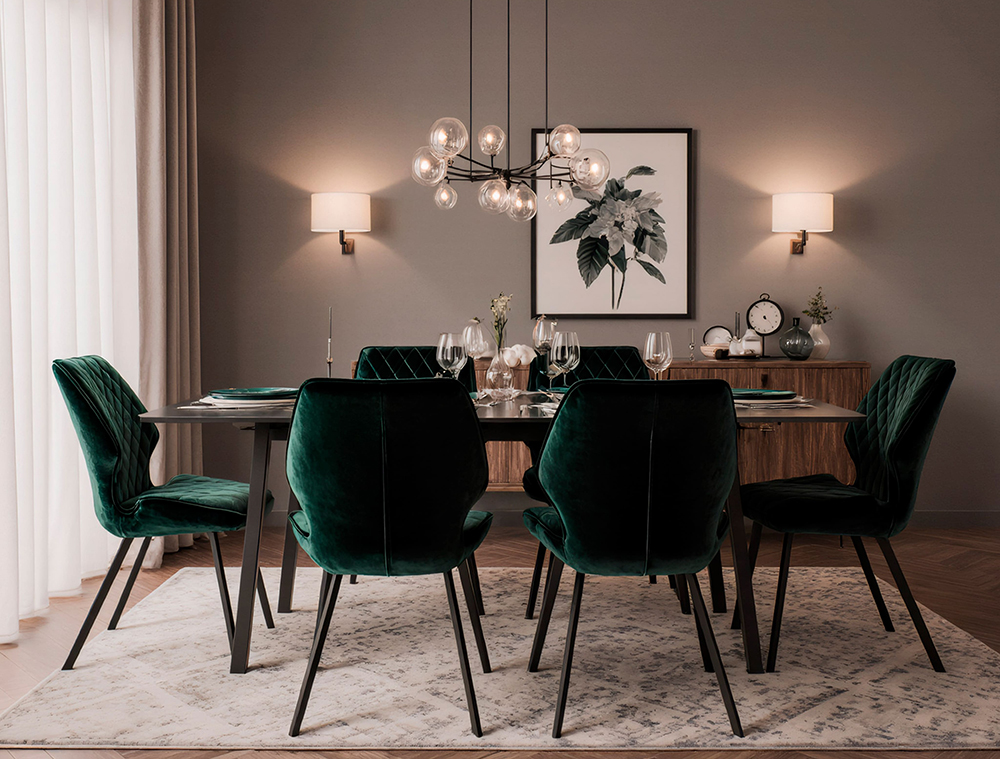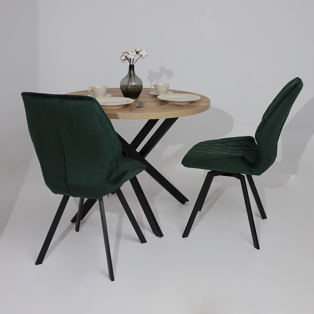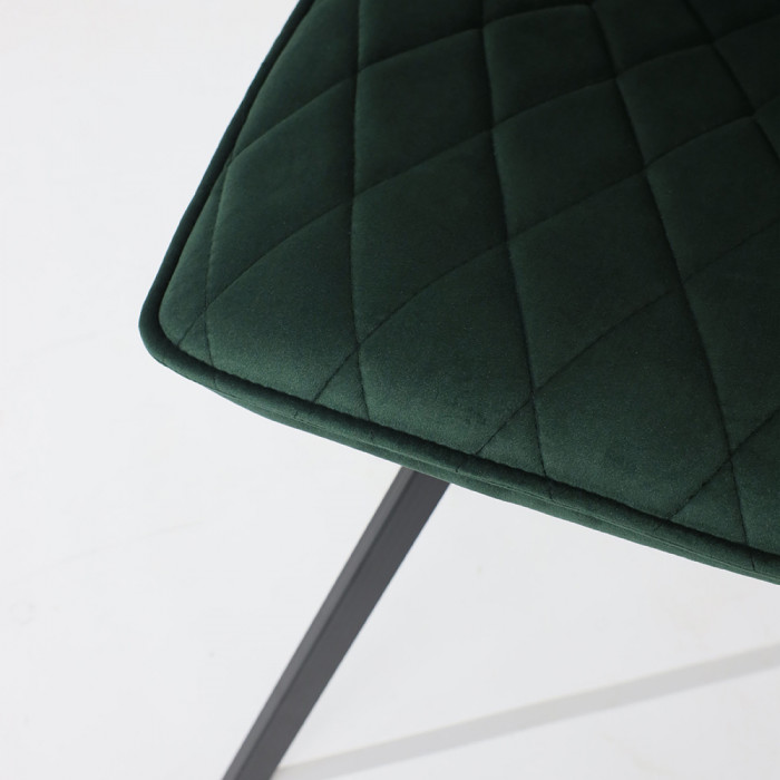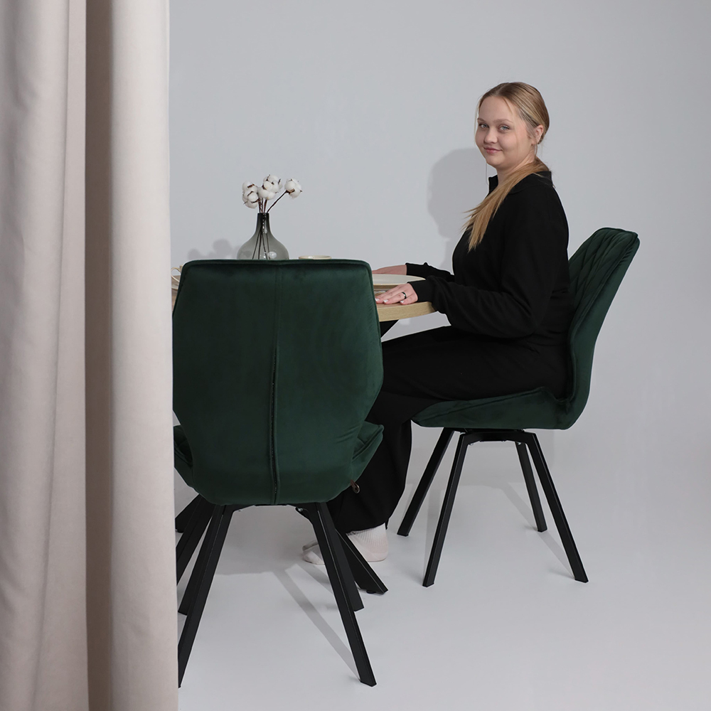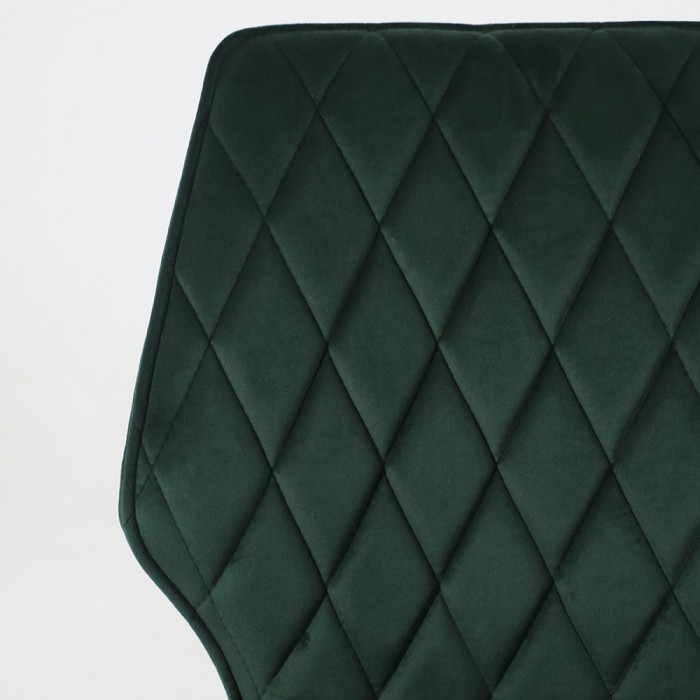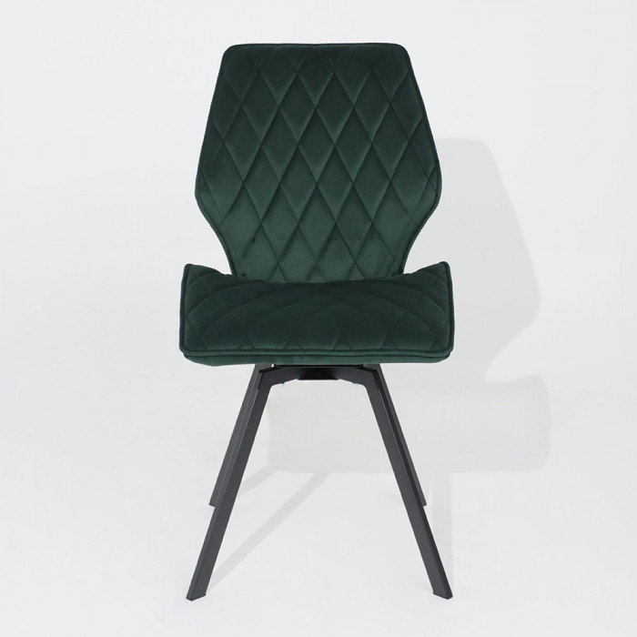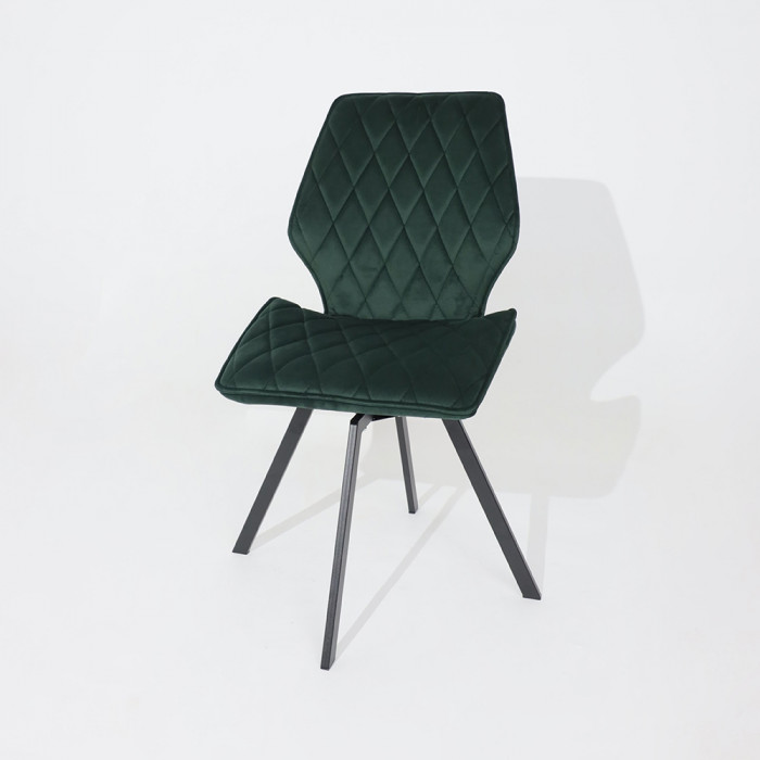 Обивка стула выполнена из мягкого и приятного на ощупь велюра, который не только выглядит роскошно, но и обеспечивает дополнительный комфорт. Ромбовидная строчка по всей обивке добавляет текстуру и изысканность, делая стул настоящим произведением искусства. Металлическое основание придает конструкции прочность и долговечность. Поворотный механизм на 360 градусов обеспечивает мобильность и удобство, позволяя легко менять положение стула без лишних усилий.