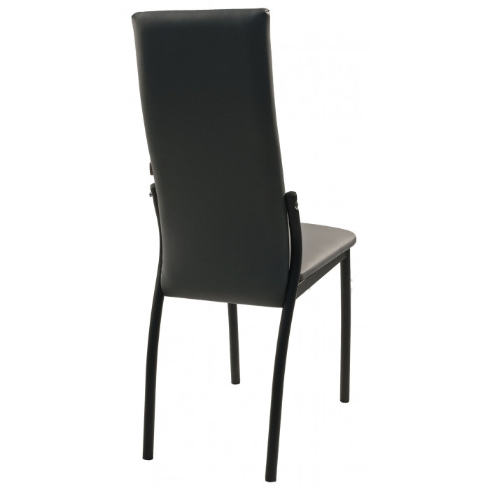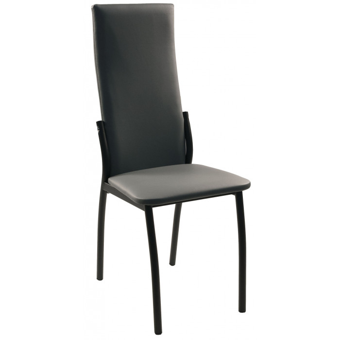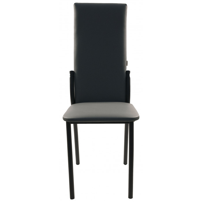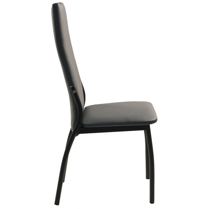 Стул отличает высокая эргономичная спинка, которая обеспечивает комфорт и правильную поддержку спины во время приёма пищи или отдыха. Сиденье и спинка выполнены из износостойкой экокожи, которая сочетается с прочным металлическим каркасом, создавая строгий и лаконичный образ. Отсутствие подлокотников делает модель компактной и удобной для размещения под столом.