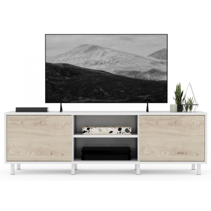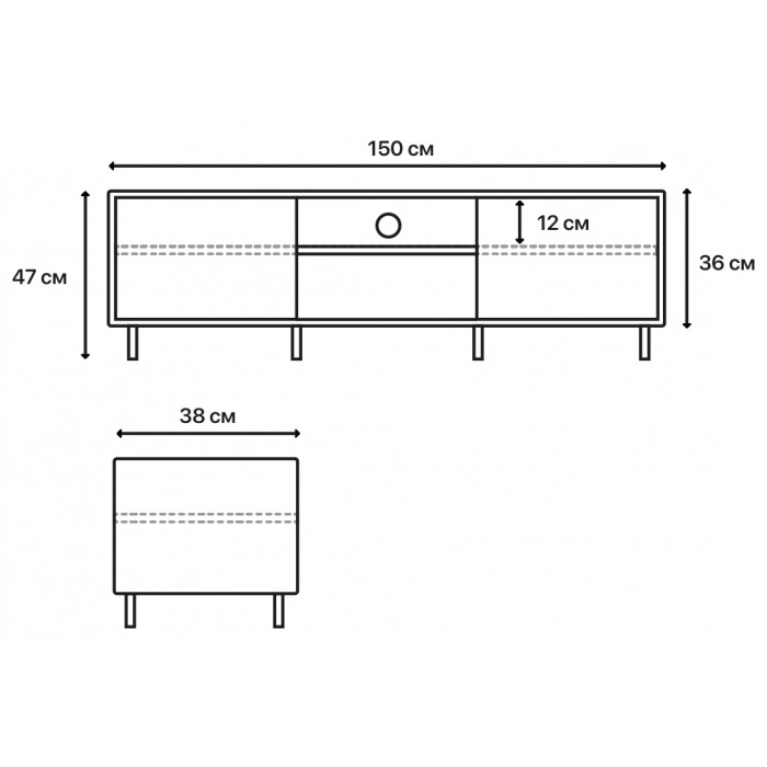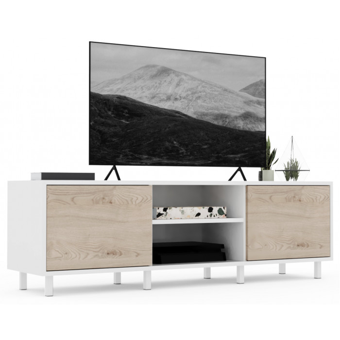 2 открывающиеся дверки с технологией открытия при нажатии PUSH-TO-OPEN. Внутри пространство делит полка. Отверстие для проводов на задней стенке тумбы.