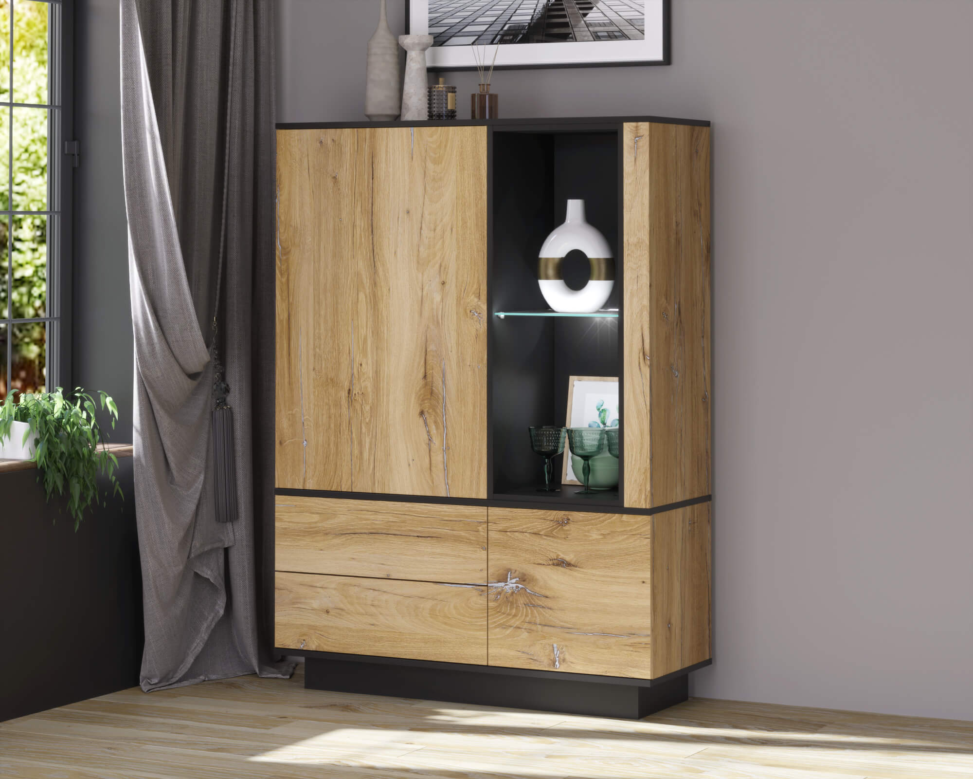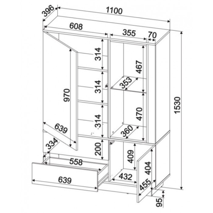 Сверху шкаф разделен на две части: в одной части расположены открытые полки, идеально подходящие для книг или аксессуаров, а во второй части полки скрыты дверцей, обеспечивая более защищенное хранение. Внизу шкафа находится выдвижной ящик, который удобен для хранения мелких предметов, и дополнительная полка с распашной дверцей, которая может быть использована для хранения посуды или других крупных предметов.
