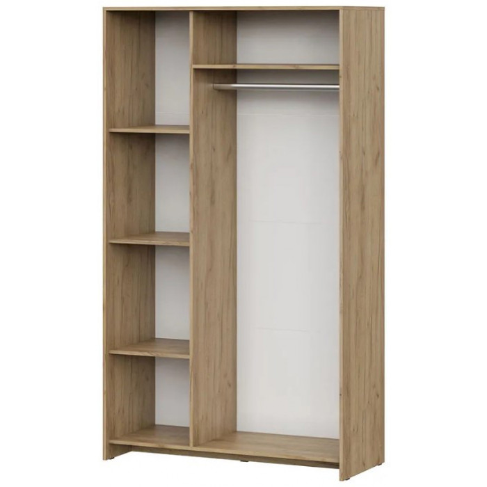 Шкаф разделен вертикальной перегородкой на две секции: бельевую и платяную. В левой бельевой секции шириной 418 мм располагаются 2 съемных и 1 стационарная полки. В правой платяной секции шириной 734 мм располагаются стационарная полка вверху и металлическая штанга.