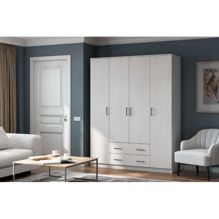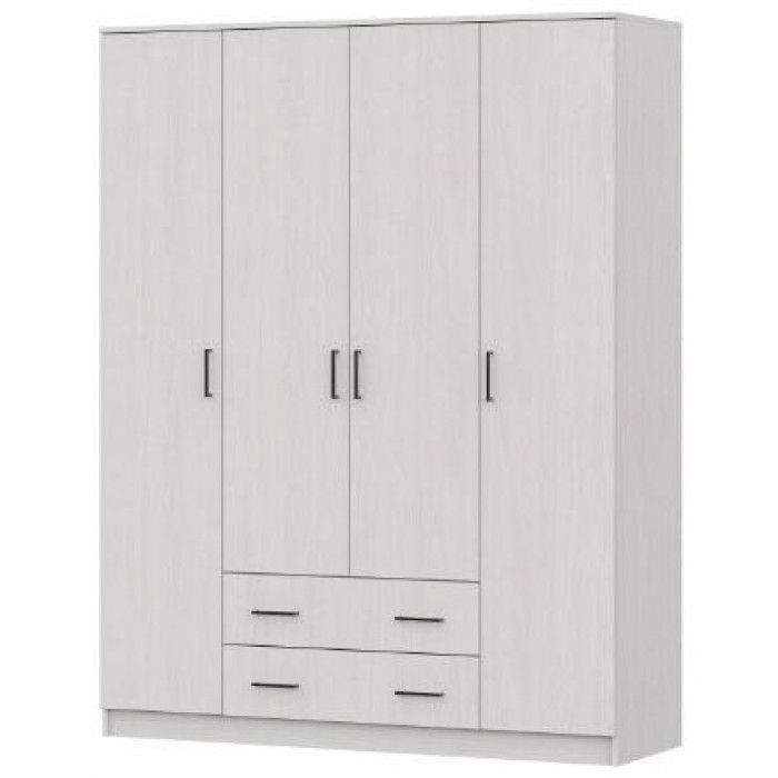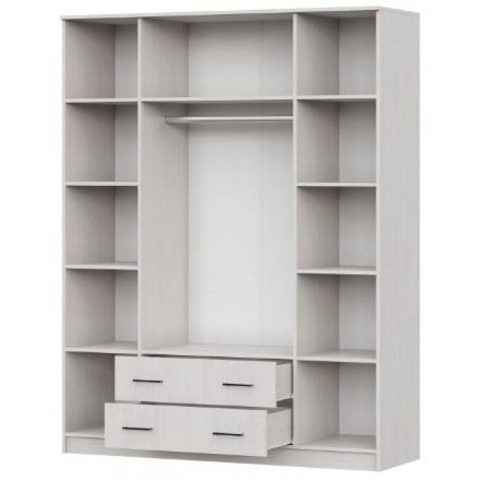 Шкаф комплектуется четырьмя распашными створками и разделен вертикальными перегородками на 3 отделения. По краям располагаются бельевые отделения шириной 384 мм. В каждой из них устанавливается по четыре полки. Посередине отделение шириной 768 мм. В нижней части отделения расположена секция с двумя выдвижными ящиками, в верхней - платяное отделение высотой 1512 мм с одной полкой сверху и металлической штангой.