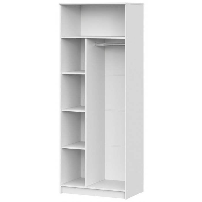 Левое отделение шкафа оснащено удобными полками, где вы сможете разместить книги, документы, декоративные элементы и другие предметы. Правая сторона шкафа предназначена для хранения одежды на вешалках.