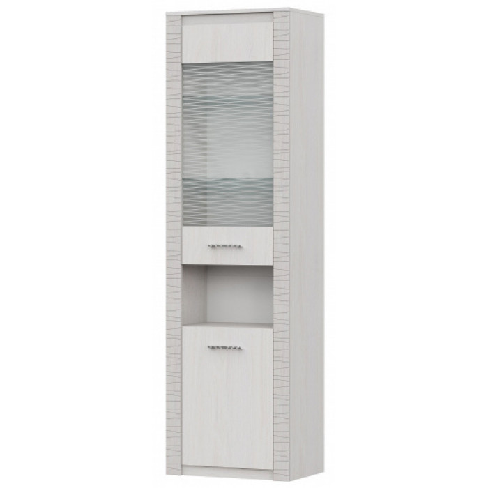 В верхней части шкафа расположено отделение со стеклянной створкой, внутри которого установлены две полки из стекла толщиной 4 мм – идеальное место для демонстрации декоративных элементов или хранения легких вещей. В нижней части находится отделение с глухой створкой, комплектующееся одной съемной полкой, что обеспечивает удобное хранение более объемных предметов.
