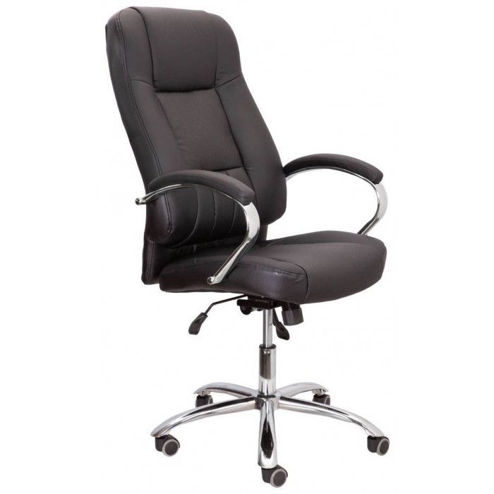 Материал презентабельно выглядит и подчеркивает статус владельца. Кресло мягкое, с увеличенной зоной подголовника и выступающими подушками, предотвращающими нагрузки на шею, спину и ноги. Высота сиденья настраивается исходя из индивидуальных параметров владельца. Модель оснащена механизмом качания Anyfix, позволяющим фиксировать угол наклона кресла в разных положениях и регулировать жесткость качания в зависимости от веса пользователя. Дополнительный комфорт обеспечивают хромированные подлокотники с мягкими накладками из кожи. Установлены газлифт 3 класса, металлическая хромированная крестовина и прорезиненные ролики. Изделие выдерживает нагрузку до 150 кг.