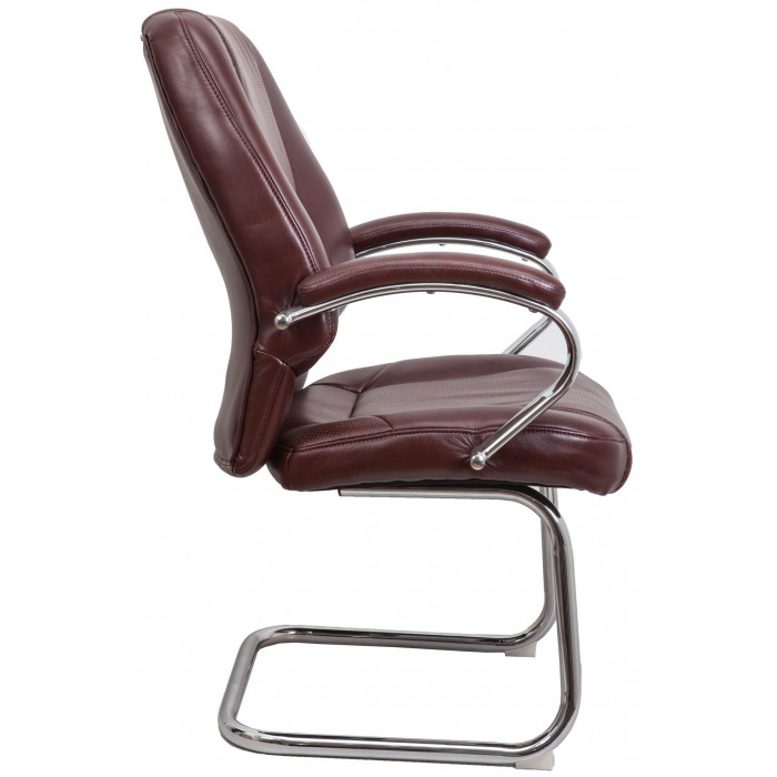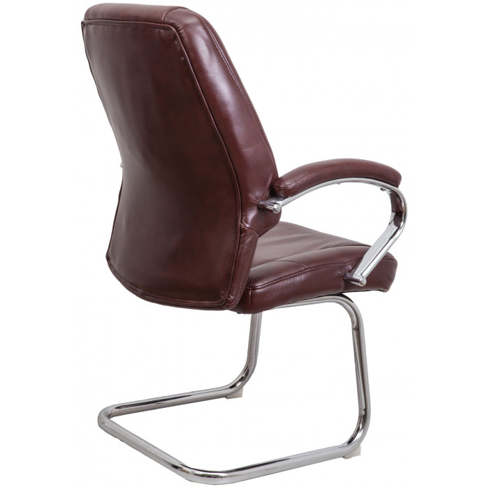 Классический дизайн модели сочетается с удобной эргономикой. Мягкие сиденье и спинка обтянуты экокожей: материал повторяет текстуру натуральной кожи, презентабельно смотрится и приятен на ощупь. Хромированные ножки выполнены в виде полозьев. Металлические подлокотники дополнены мягкими накладками из экокожи.
