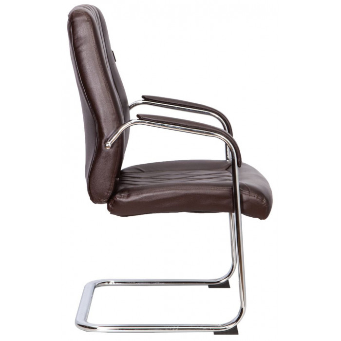 Выполнено на основе устойчивого хромированного металлического каркаса. Сиденье обито экологической кожей и имеет мягкую вставку. Спинка анатомической формы, что обеспечивает поддержку позвоночника и комфортность посадки. Подлокотники изготовлены из металла и частично обтянуты экокожей.