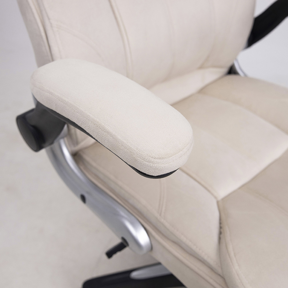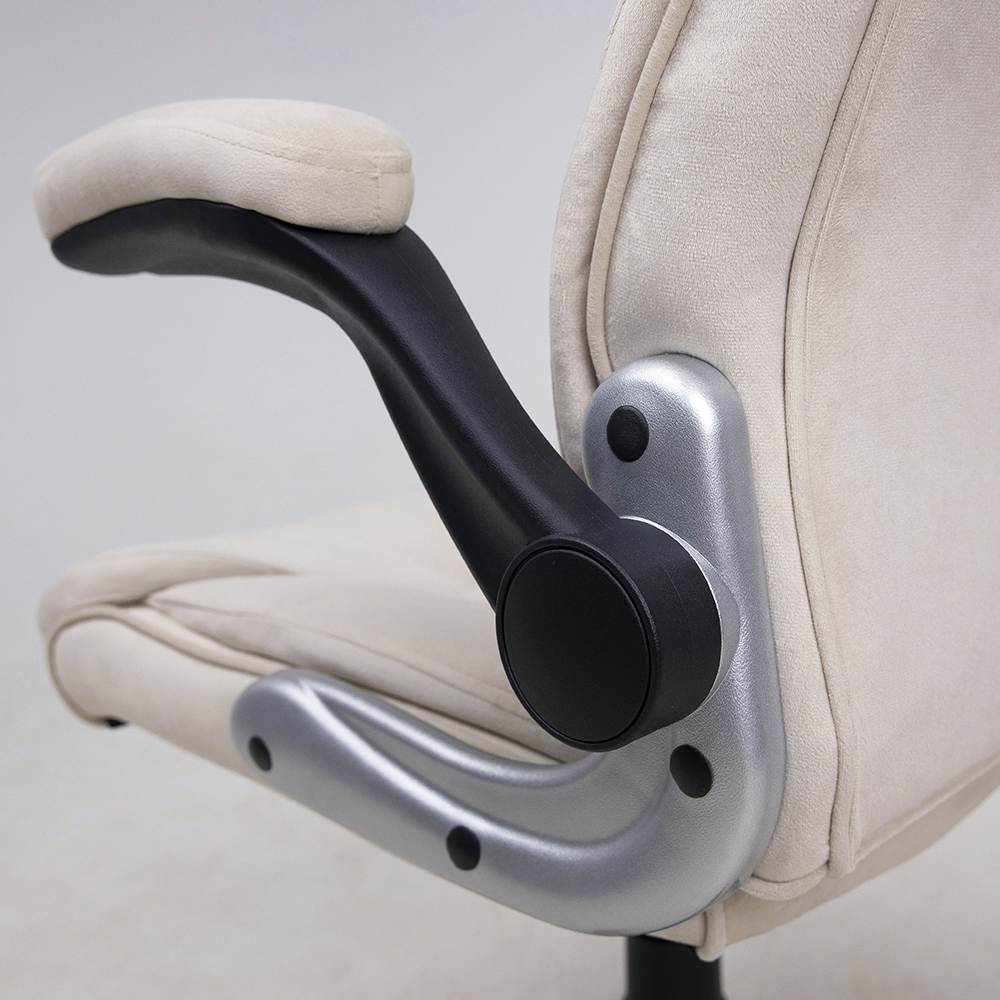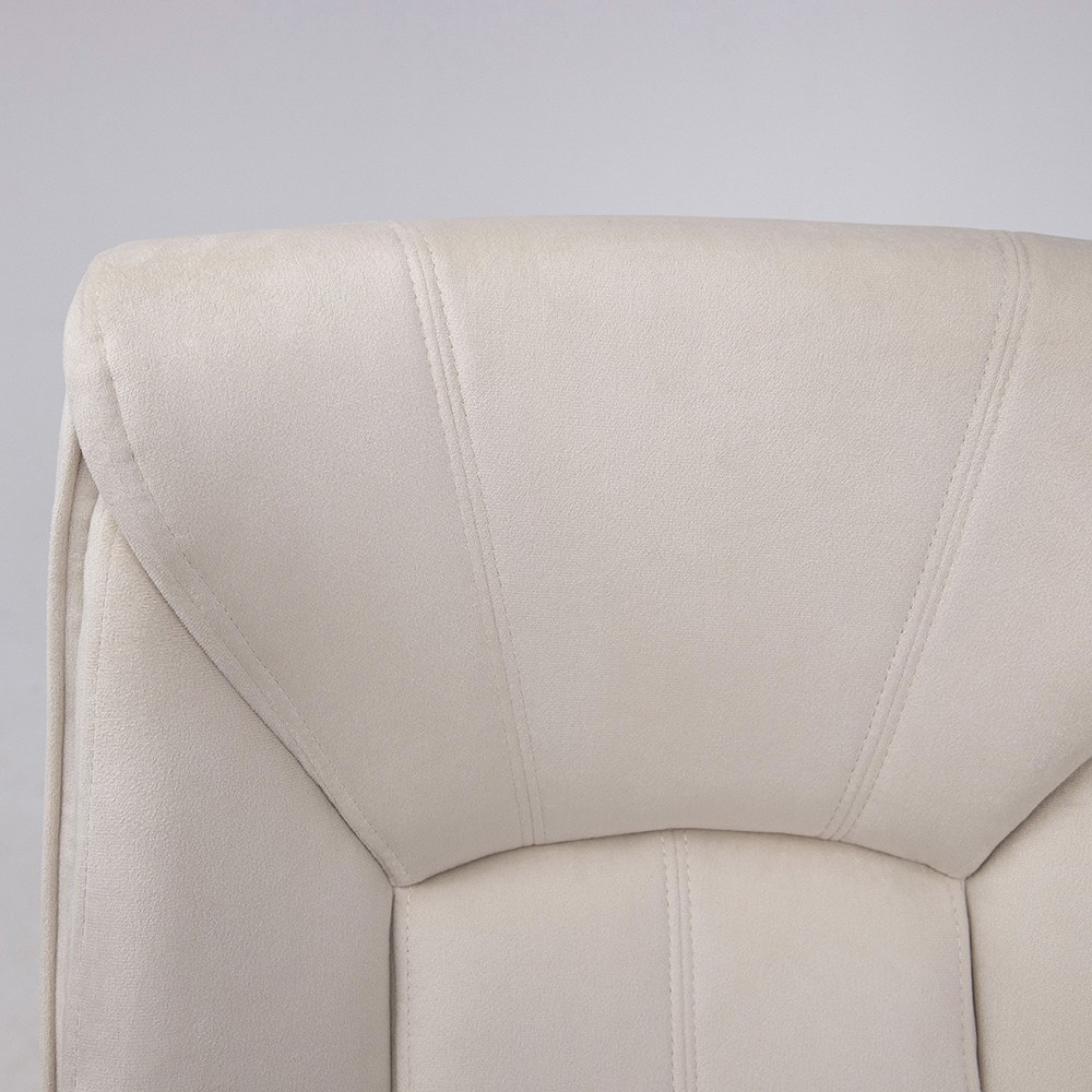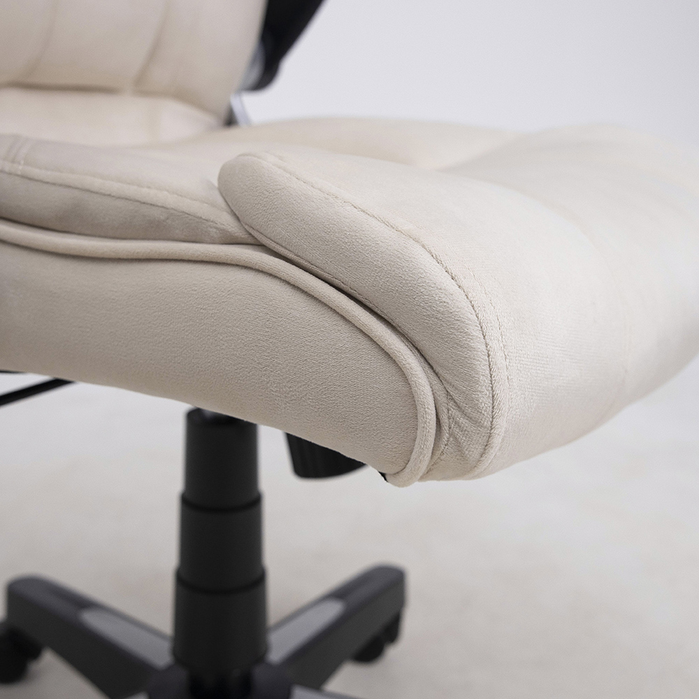 Толстое сиденье c пружиной внутри обеспечивает мягкость и комфортную посадку. Обивка выполнена из велюровой ткани: материал прекрасно смотрится и приятен на ощупь. Спинка фиксируется под углом 90-135 градусов. Пластиковые откидные подлокотники дополнены мягкими накладками. Установлены прочная крестовина из армированного полиамида и усиленные пластиковые ролики. Изделие выдерживает нагрузку до 120 кг.