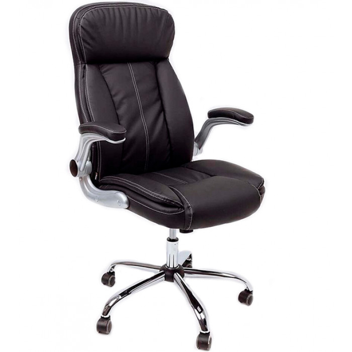 Сиденье и спинка обтянуты экокожей: искусственный материал повторяет фактуру натуральной кожи, презентабельно смотрится и приятен на ощупь. Подлокотники откидываются назад, снабжены мягкими накладками. Установлена хромированная крестовина, газлифт 3 класса и прорезиненные ролики. Максимальная нагрузка на изделие: 120 кг.