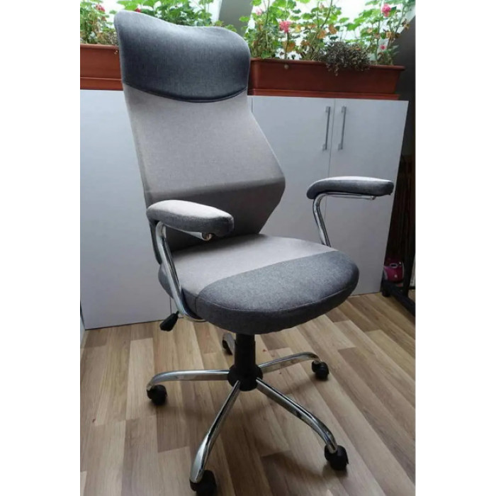 Прочная тканевая обивка серого цвета сочетает в себе износостойкость и тактильный комфорт, а металлическая крестовина гарантирует устойчивость и долговечность. Механизм DMS с регулировкой наклона позволяет снять напряжение со спины во время коротких пауз, а эргономичные нерегулируемые подлокотники обеспечивают удобную поддержку рук. Благодаря нагрузке до 120 кг кресло подходит для большинства пользователей.