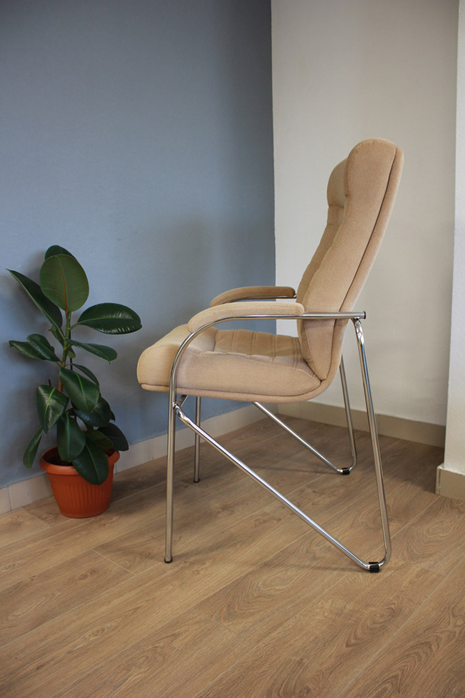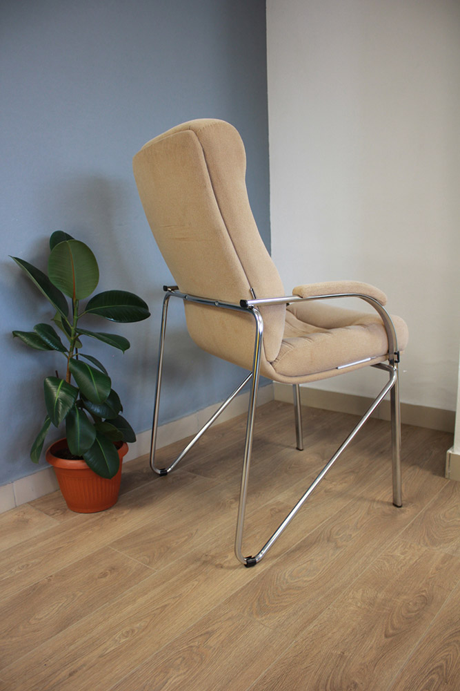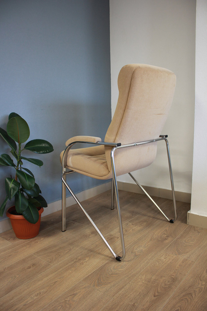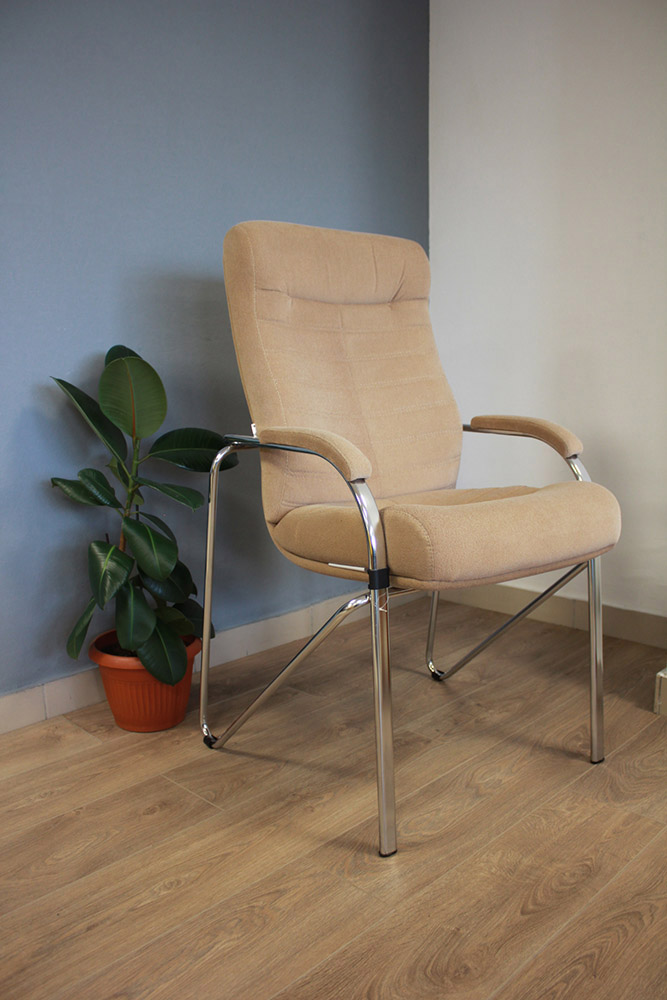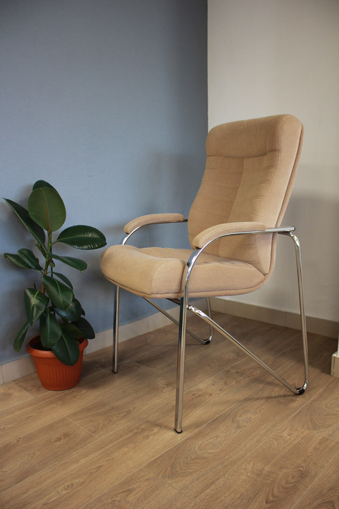 Стул может быть выполнен из ткани или искусственной кожи. Цветовая гамма также разнообразна: черный, бежевый, желтый, зеленый, коричневый, шоколадный, красный и др.