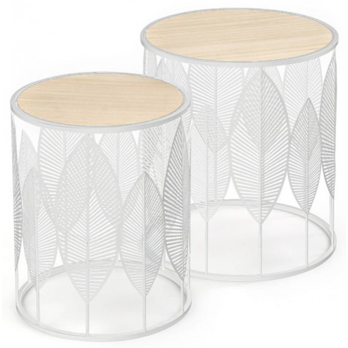 Комплект журнальных столиков HALMAR FOLLA — стильное и современное решение для гостиной, зоны отдыха или спальни. Два столика разного размера можно использовать как вместе, создавая эффектную многоуровневую композицию, так и отдельно — для рационального зонирования пространства. Ажурный металлический каркас с рисунком в виде листьев придаёт мебели лёгкость и изящество, делая её выразительным элементом интерьера в скандинавском или современном стиле.