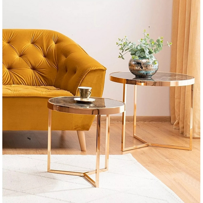 Столики отличаются изысканным дизайном, сочетающим столешницы с эффектом мрамора и роскошный золотистый каркас. Это придаёт комплекту благородный и современный вид, идеально вписывающийся в интерьеры в стиле гламур, модерн или лофт.