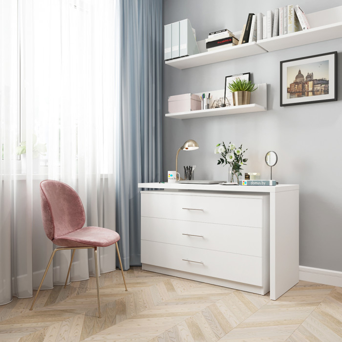 ДОМУС СТР07 — это стильный гибрид, сочетающий функции рабочего стола, комода и даже туалетного столика. Благодаря поворотному механизму и компактным размерам в сложенном виде, он идеально подходит для малогабаритных помещений, легко адаптируясь под разные сценарии использования.