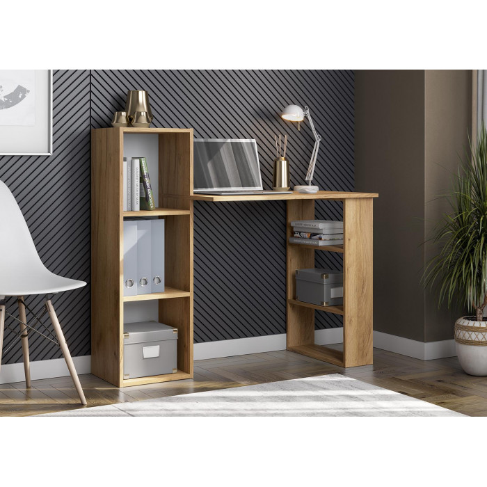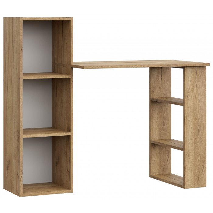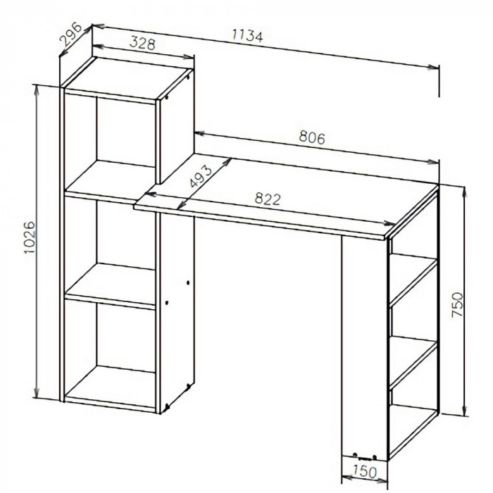С одной стороны столешница опирается на открытый стеллаж размером 150х734х460 мм с двумя полками. С другой стороны столешница пристыковывается к открытому пеналу размером 328х1026х296 мм также с двумя полками. Стол можно собрать на любую сторону. Максимально допустимая нагрузка на столешницу — 15 кг, на полки — 5 кг.