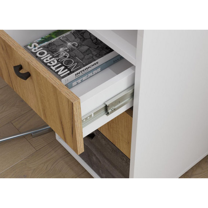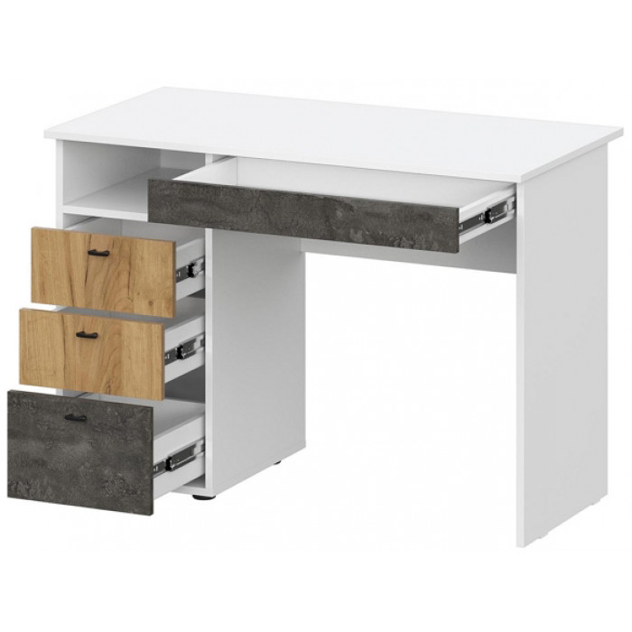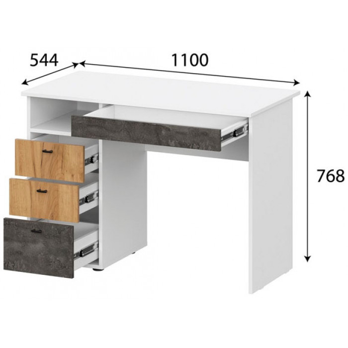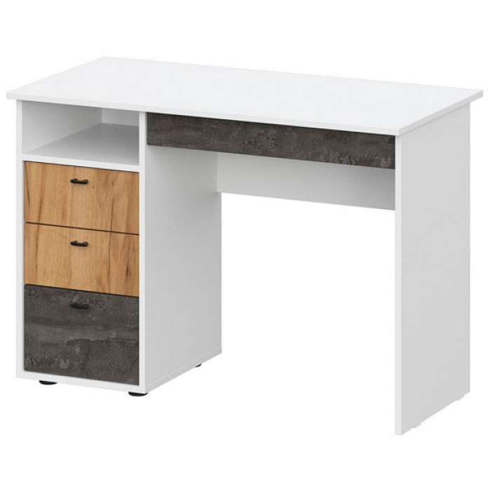 Конструкция включает три удобных выдвижных ящика, которые помогут хранить документы, канцелярию и другие необходимые мелочи, сохраняя порядок на столе. Между ящиками и столешницей расположена открытая полка, идеально подходящая для размещения книг, папок или декоративных элементов. Стол станет отличным выбором для тех, кто ценит комфорт, порядок и эстетику.