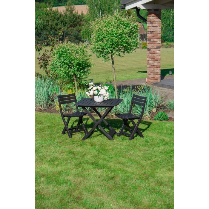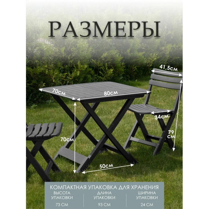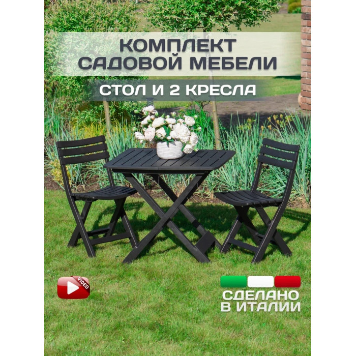 Комплект садовый мебели (стол и два кресла) изготовлен по европейским стандартам из первоклассного пластика, качественного и безопасного для здоровья как взрослых, так и детей.