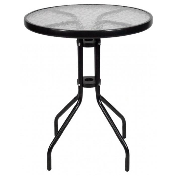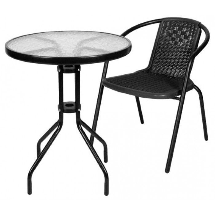Комплект Derio Uno включает круглый стол с закаленной стеклянной столешницей и одно кресло с основанием из пластика под ротанг. Идеальное решение для небольших балконов и террас, рассчитанное на нагрузку до 100 кг.