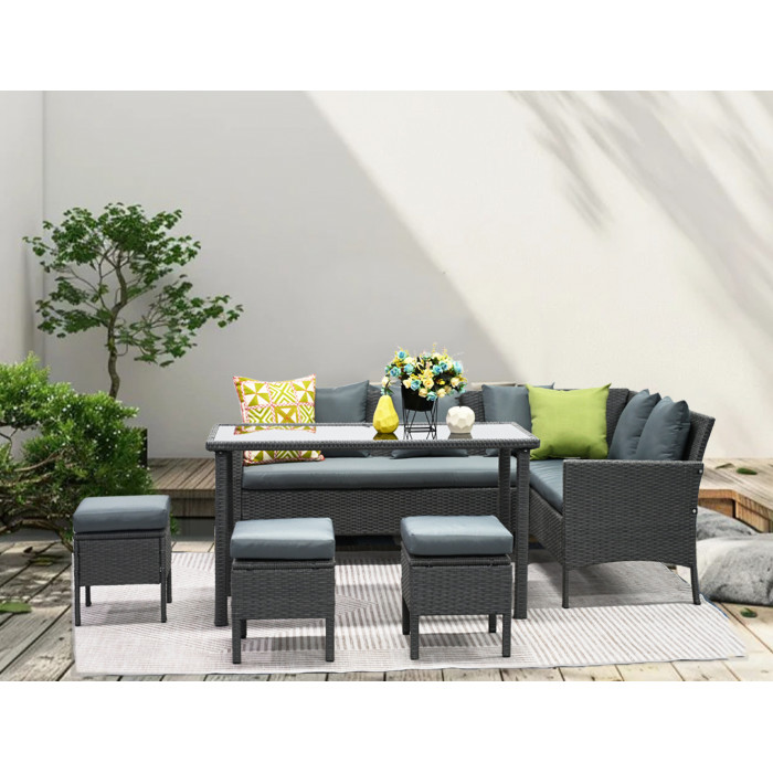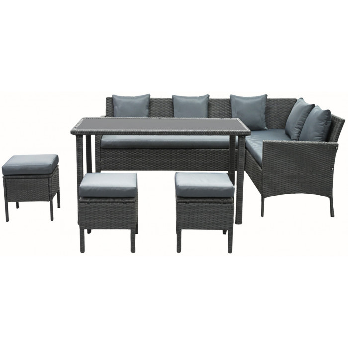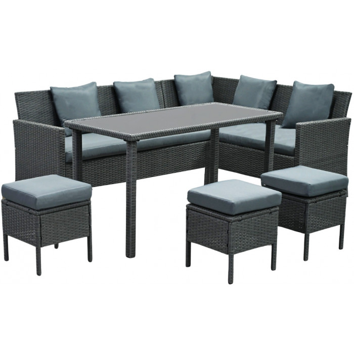Изысканный комплект садовой обеденной мебели Sundays LUC-95 с комфортом позволит разместить 8 гостей. Комплект состоит из дивана, трех табуретов и стола.