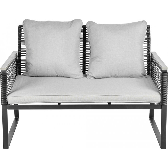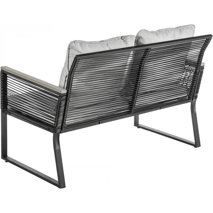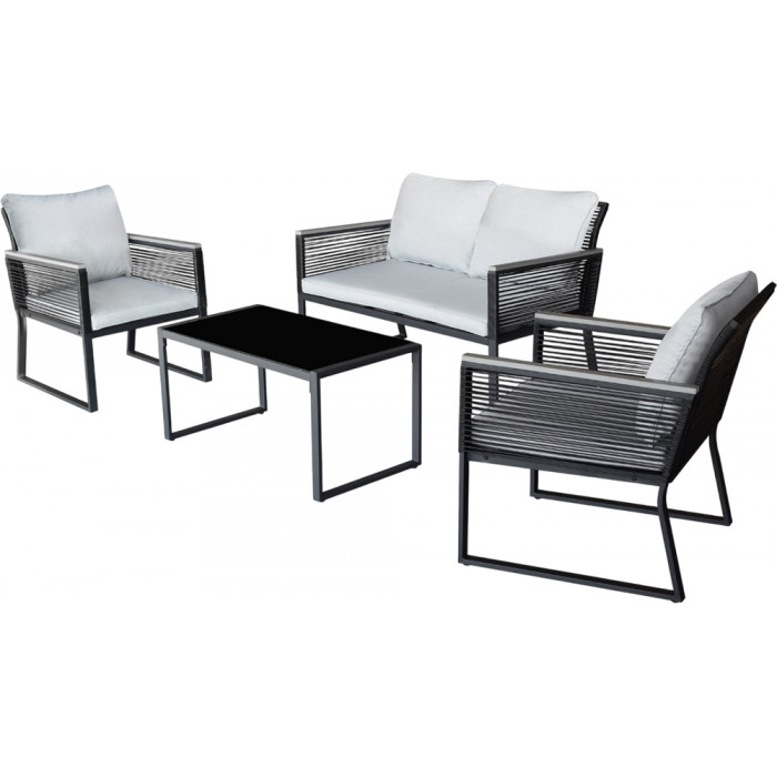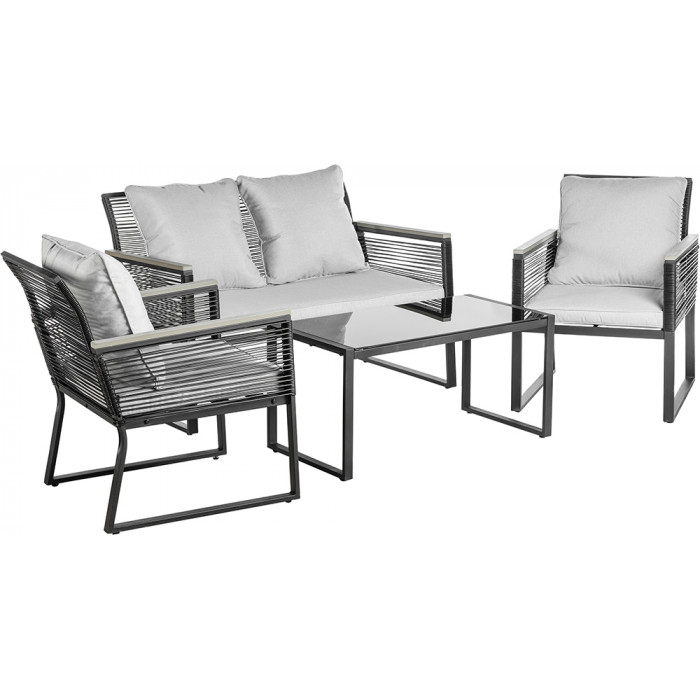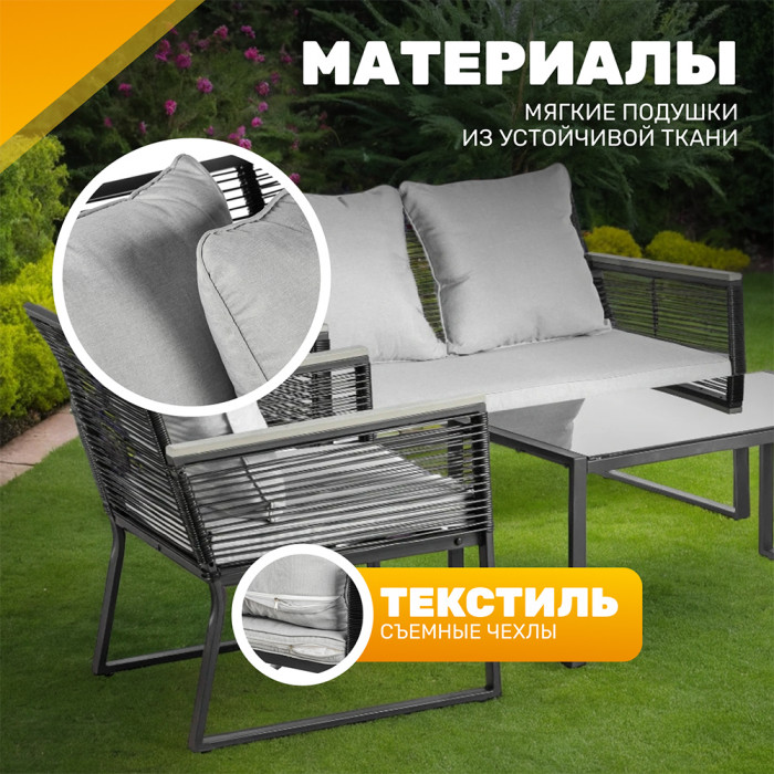 Комплект садовой мебели из четырех предметов подходит для обустройства веранды или загородного дома. В набор входит диван, два кресла и прямоугольный столик с черной столешницей из закаленного стекла толщиной 5 мм.