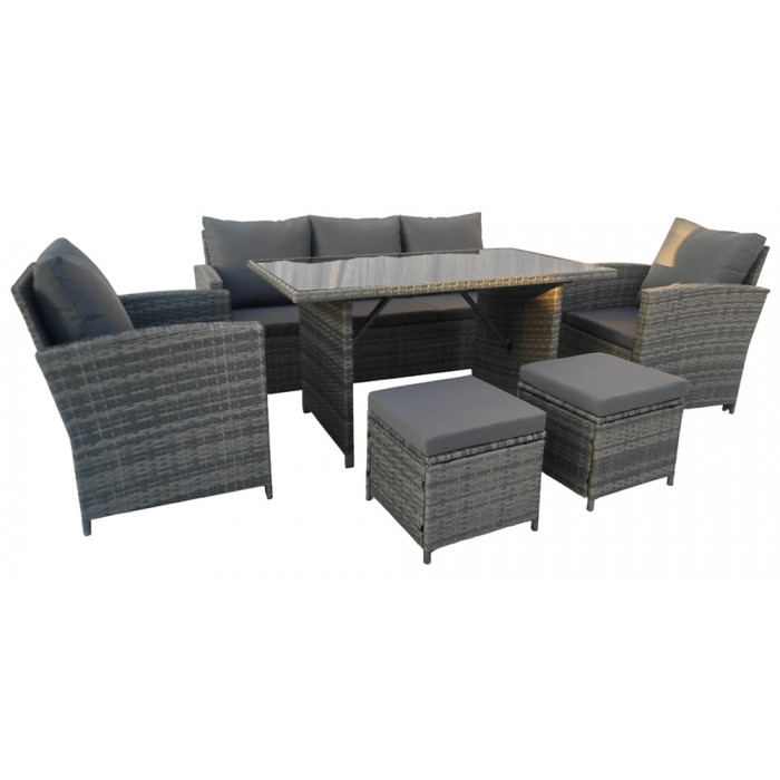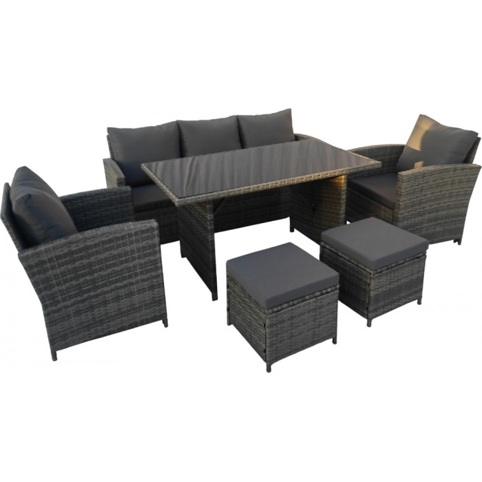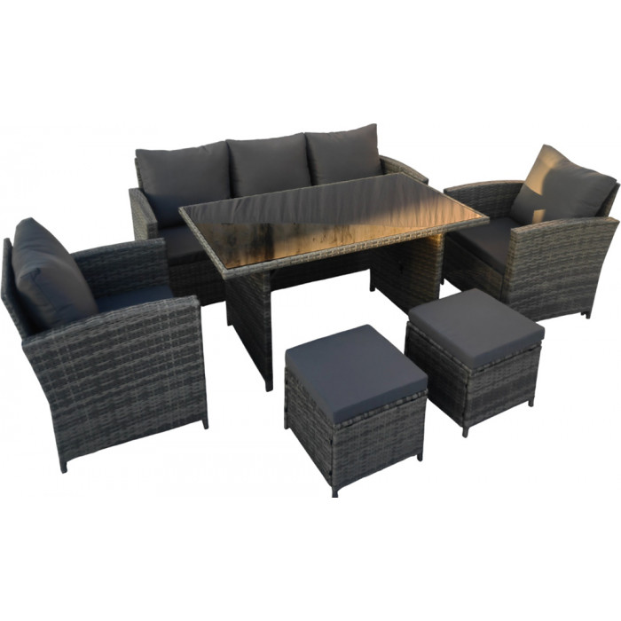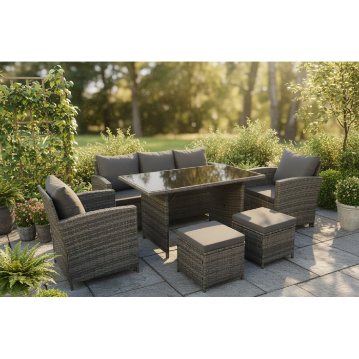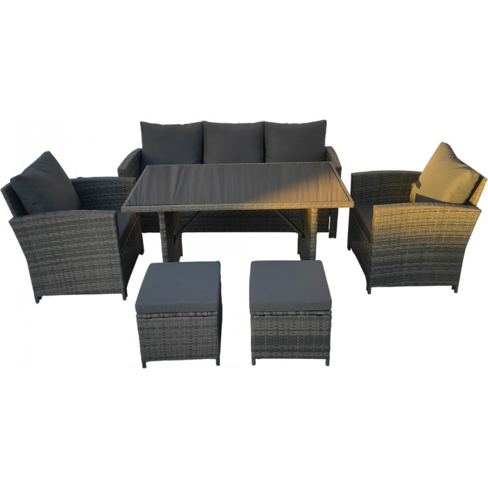 Комплект садовой мебели из шести предметов создает комфортную зону отдыха для загородного дома, веранды, террасы или сада. В набор входят прямоугольный стол, диван, два кресла и два пуфа, что позволяет разместить до семи человек.