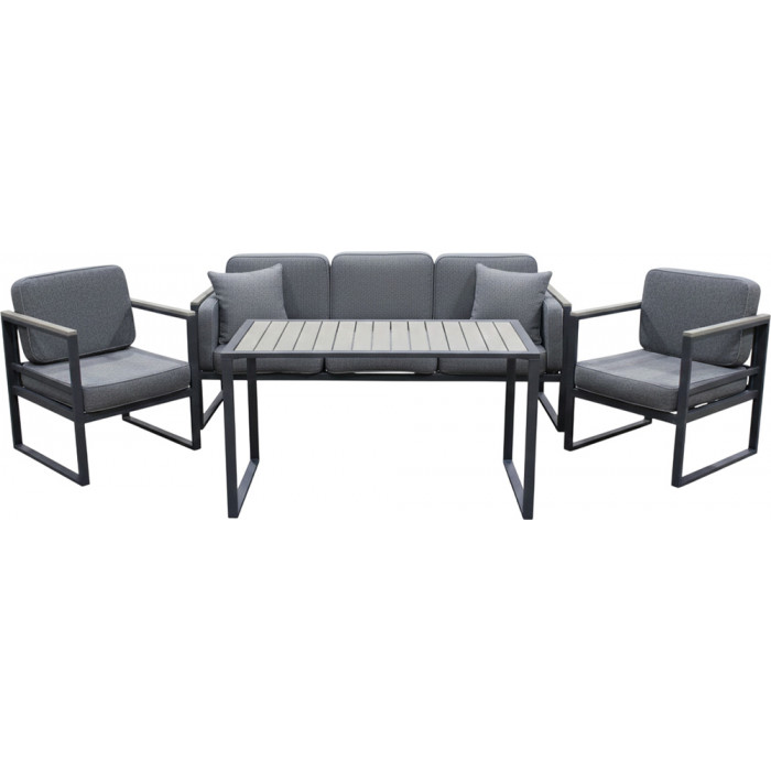 Комплект садовой мебели создает комфортную зону отдыха для загородного дома, веранды, террасы или сада. В набор входят стол, диван, два кресла, что позволяет разместить до четырех человек.