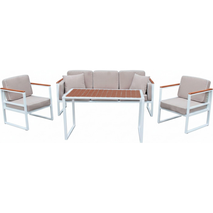 Комплект садовой мебели создает комфортную зону отдыха для загородного дома, веранды, террасы или сада. В набор входят стол, диван, два кресла, что позволяет разместить до четырех человек.