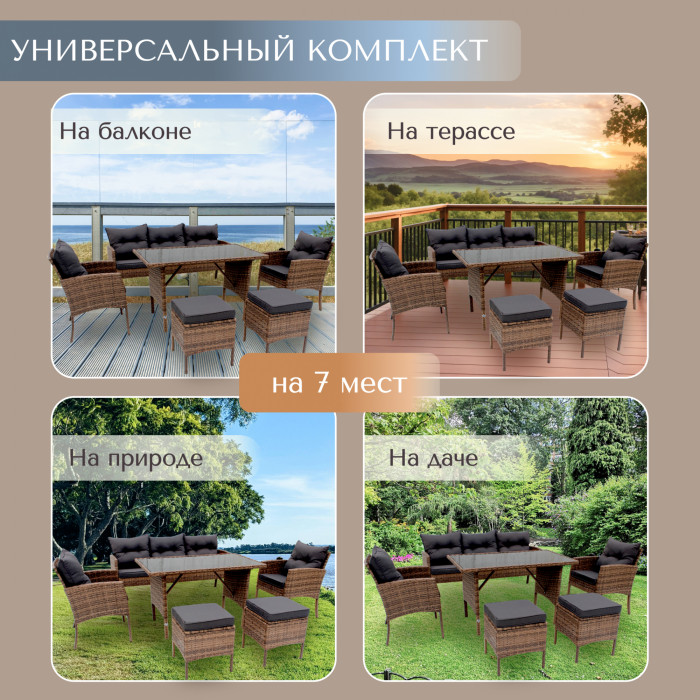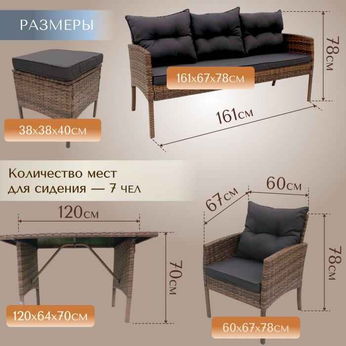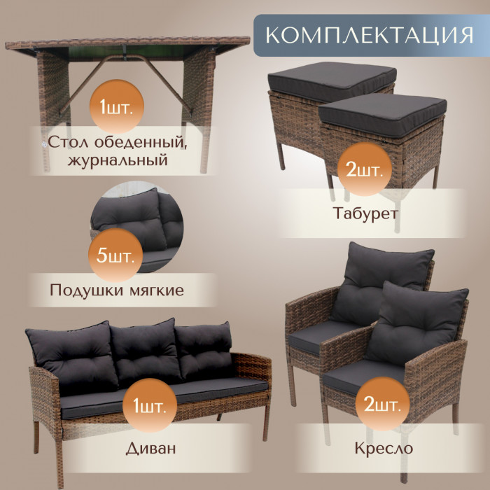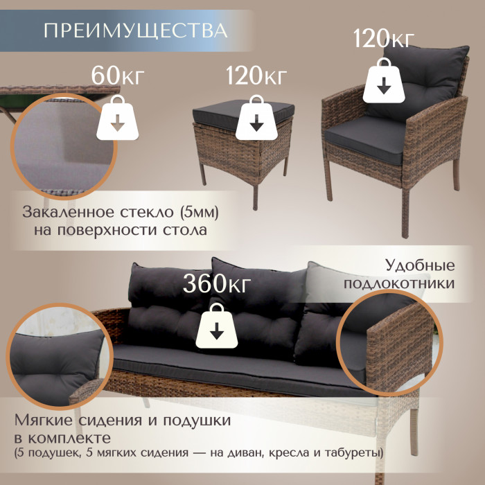 Комплект садовой мебели ⎯ отличное решение для оформления вашего загородного дома или дачного участка. Комплект прекрасно подойдет для приятного времяпровождения всей семьей на открытом воздухе. Мебель изготовлена из ротанга, этот материал: долговечный погодоустойчивый, не выгорает на солнце, не боится дождя и выдерживает большие нагрузки. Чехол для подушки съемный для очистки. Прочные рамы сидений обеспечивают стабильность и комфорт. Идеальный набор из ротанга для создания непринужденной атмосферы. Элегантный внешний вид.