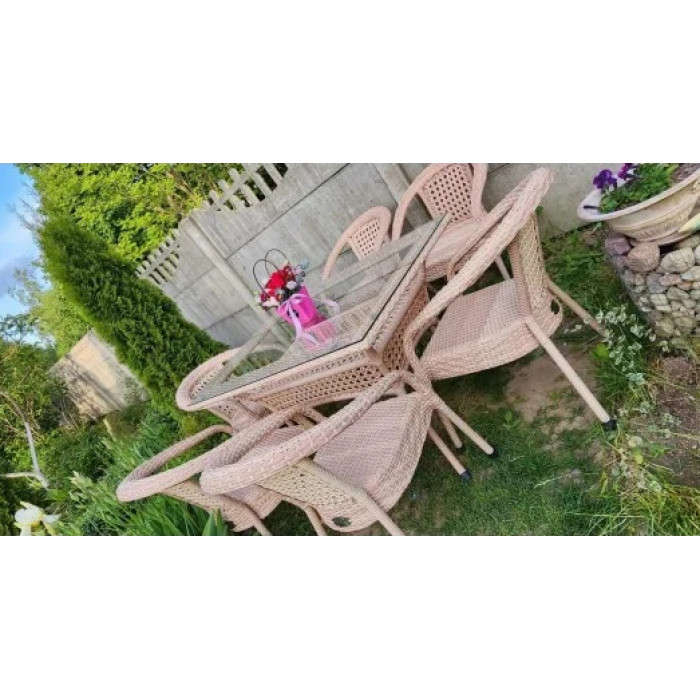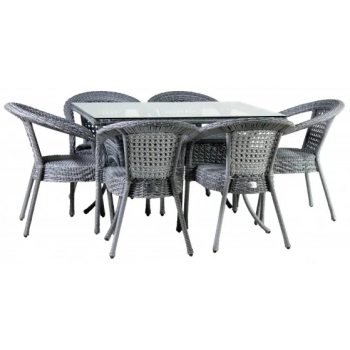 Комплект плетеной мебели из искусственного ротанга на 6 персон. Не боится влаги, прямых солнечных лучей, мороза. Не требует особого ухода. Легко моется. Рекомендованная температура эксплуатации -16/+50. Нить плоская.