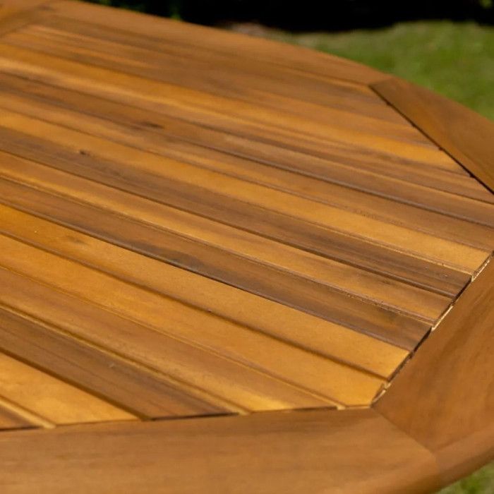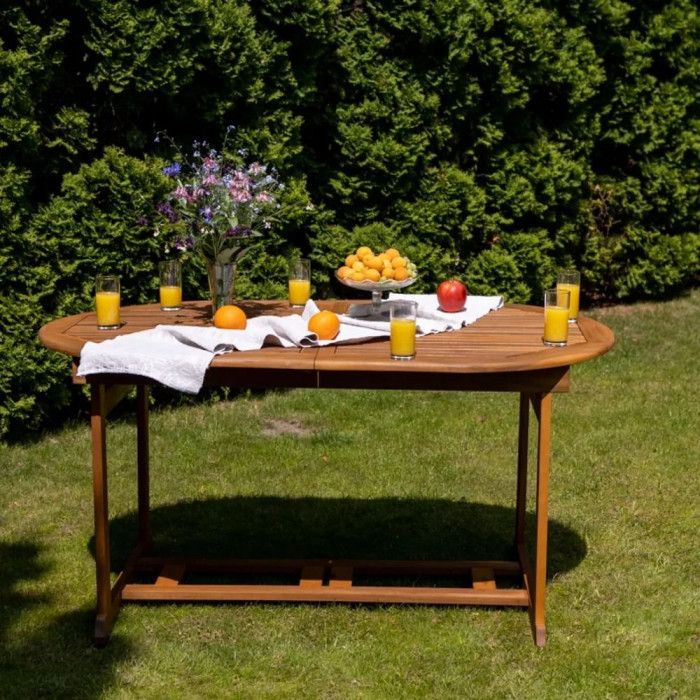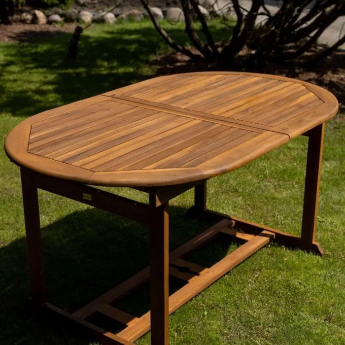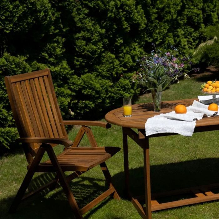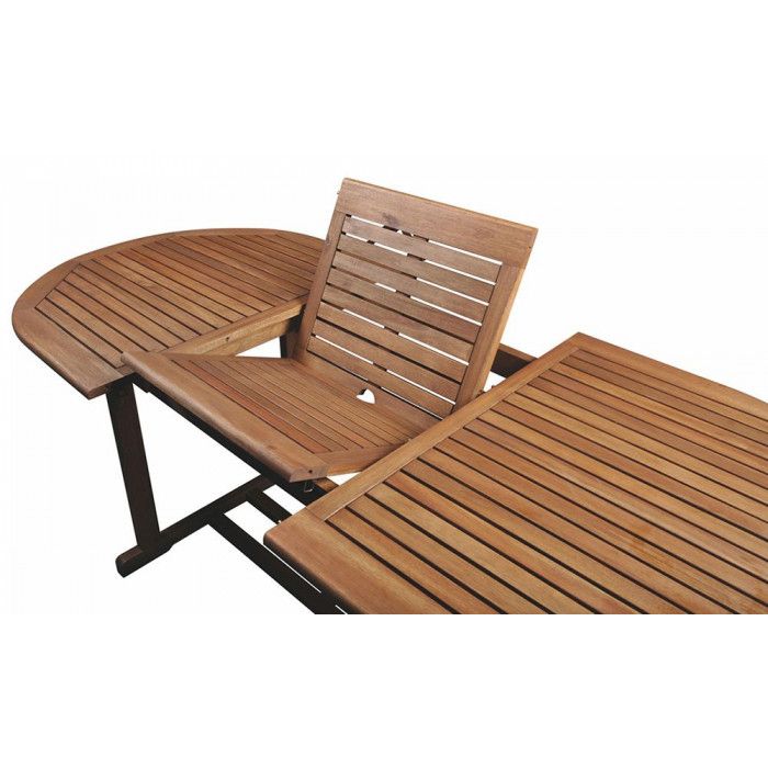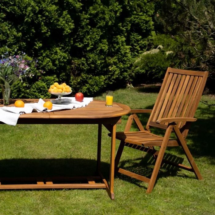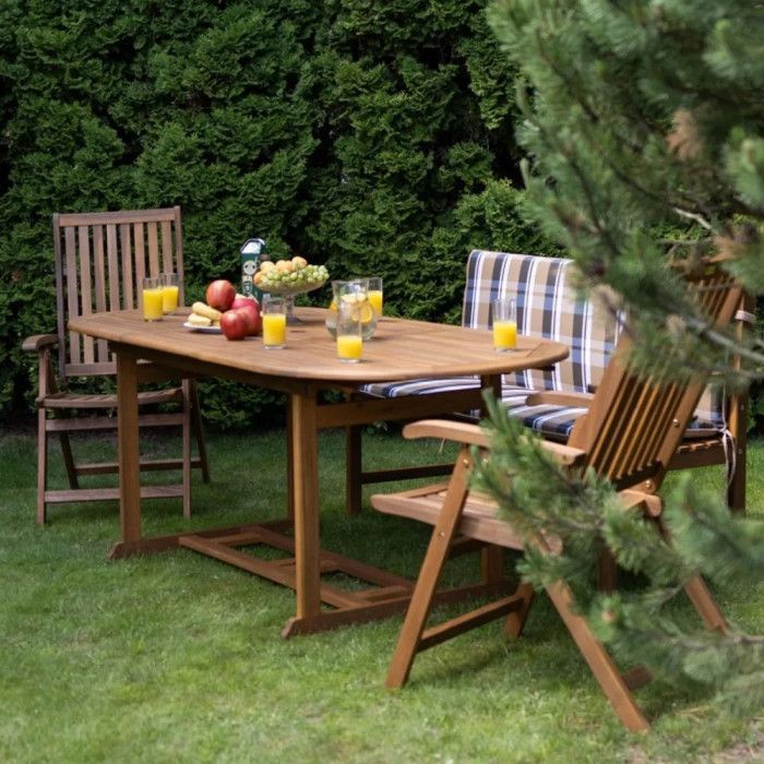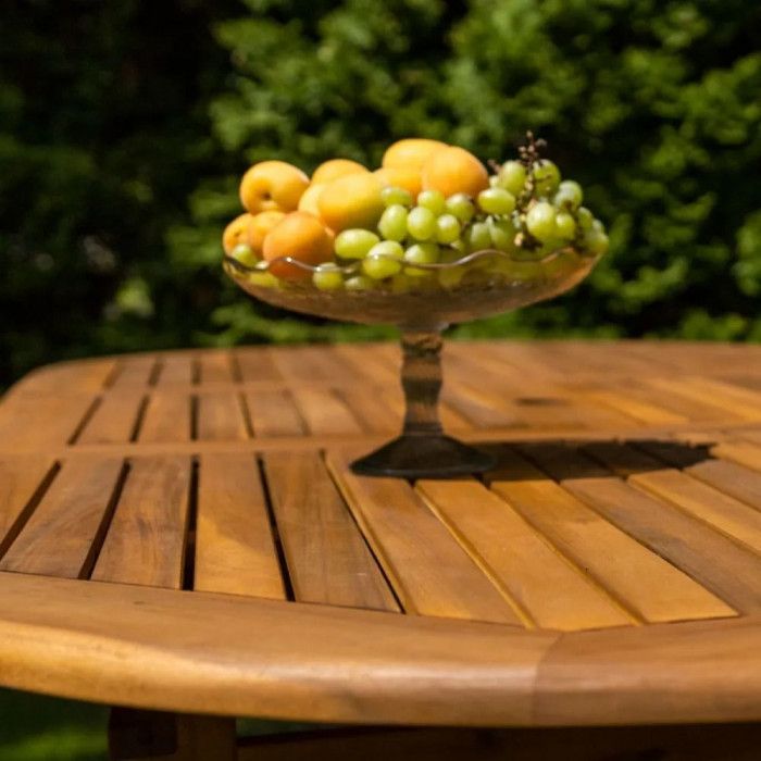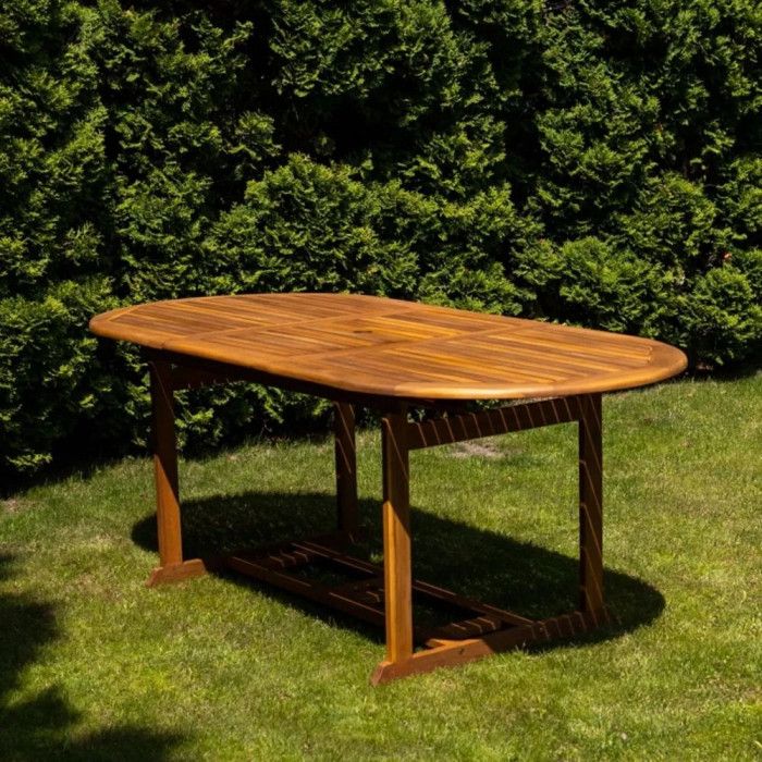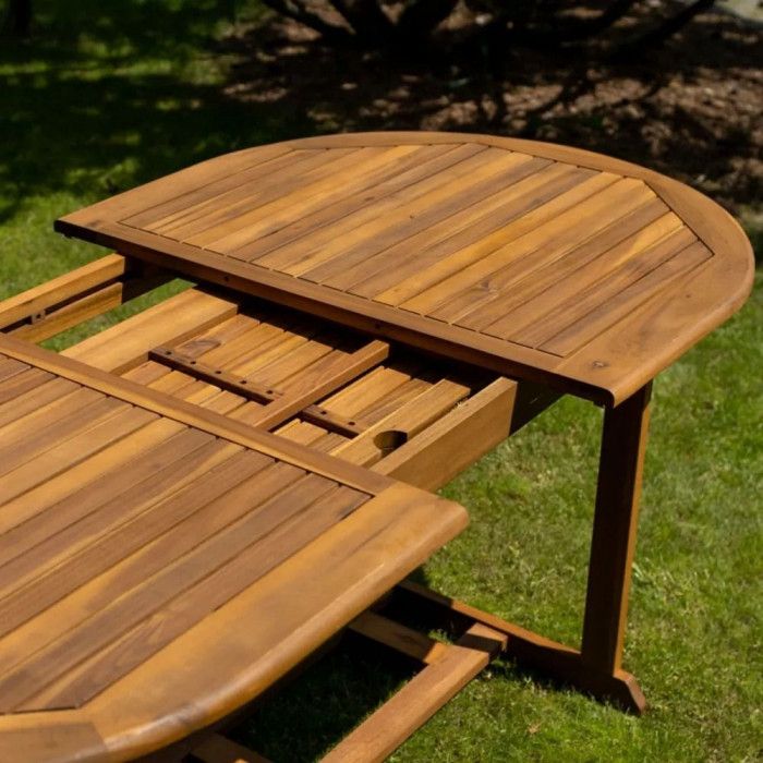 Изготовленный из благородной тропической акации, он обладает природной устойчивостью к влаге и ультрафиолету, что делает его идеальным для использования как на открытом воздухе, так и в интерьере. В центре стола предусмотрено отверстие для зонта, создающего уютную тень в жаркий день. Благодаря универсальным размерам стол можно комбинировать с комплектом из шести стульев или дополнить четырьмя стульями и скамьей – он станет идеальным местом для семейных обедов и дружеских посиделок.